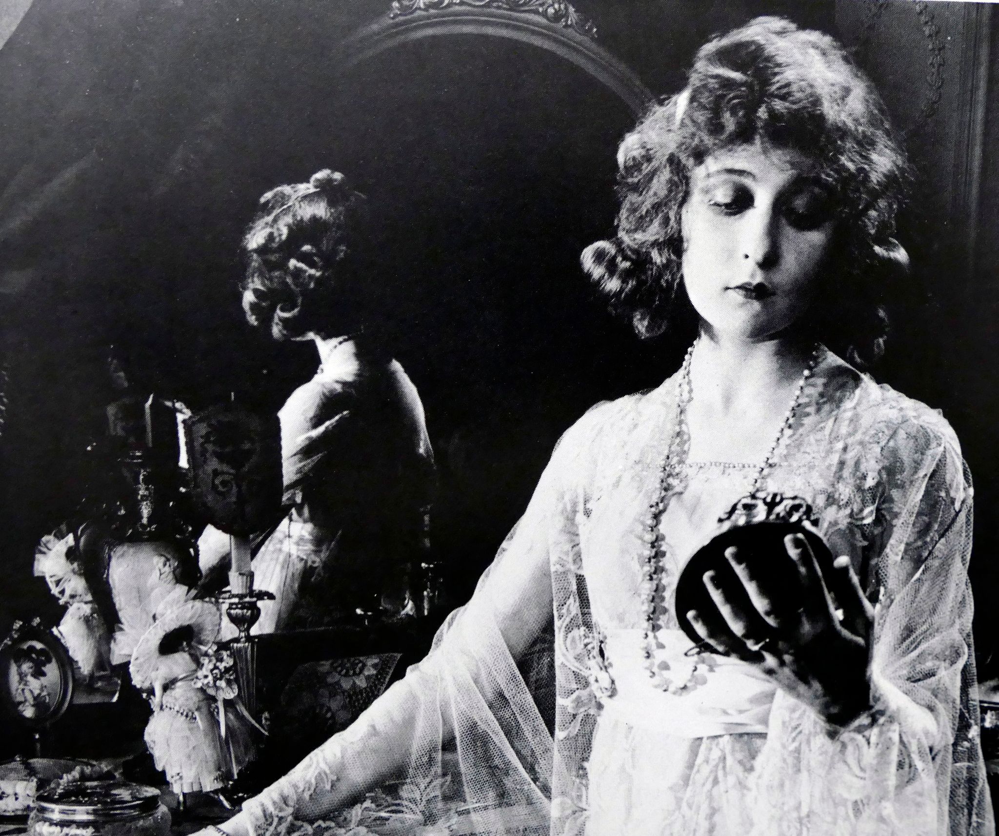 圖為1918年默片電影《丈夫的唯一》(For Husband's Only,暫譯)的劇照,由露易絲.韋伯執導,本片已經佚失。圖右為女主角蜜兒德里.哈瑞斯(Mildred Harris),為喜劇泰斗卓別林(Charlie Chaplin)的第一任妻子。