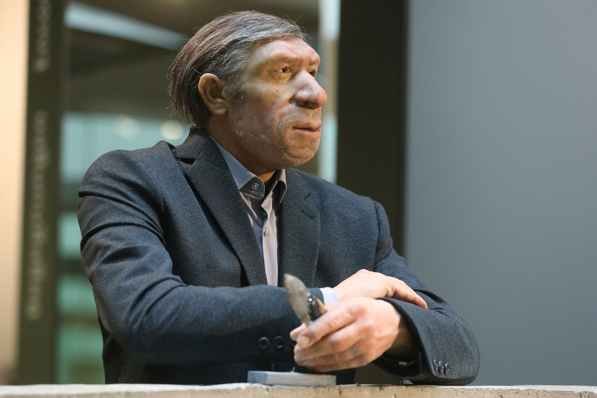 在德國的尼安德塔人博物館(Neanderthal Museum)慶祝25周年,替館內的尼安德塔人穿西裝打領帶,這位史前人類手上還輕握著石刀。圖攝於2021年9月,德國梅特曼(Mettmann)。