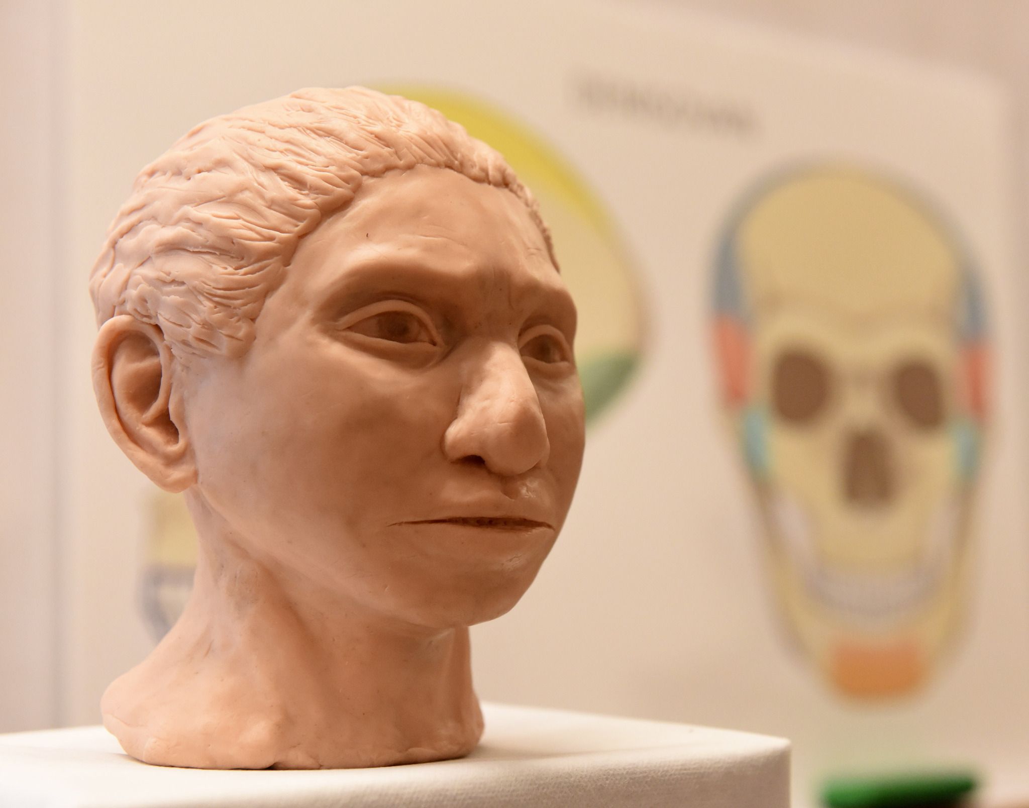 經由3D列印重建的女性丹尼索瓦人相貌。圖攝於2019年9月,為以色列耶路撒冷希伯來大學(The Hebrew University of Jerusalem)的計算生物學教授卡梅爾(Liran Carmel)發布的研究。