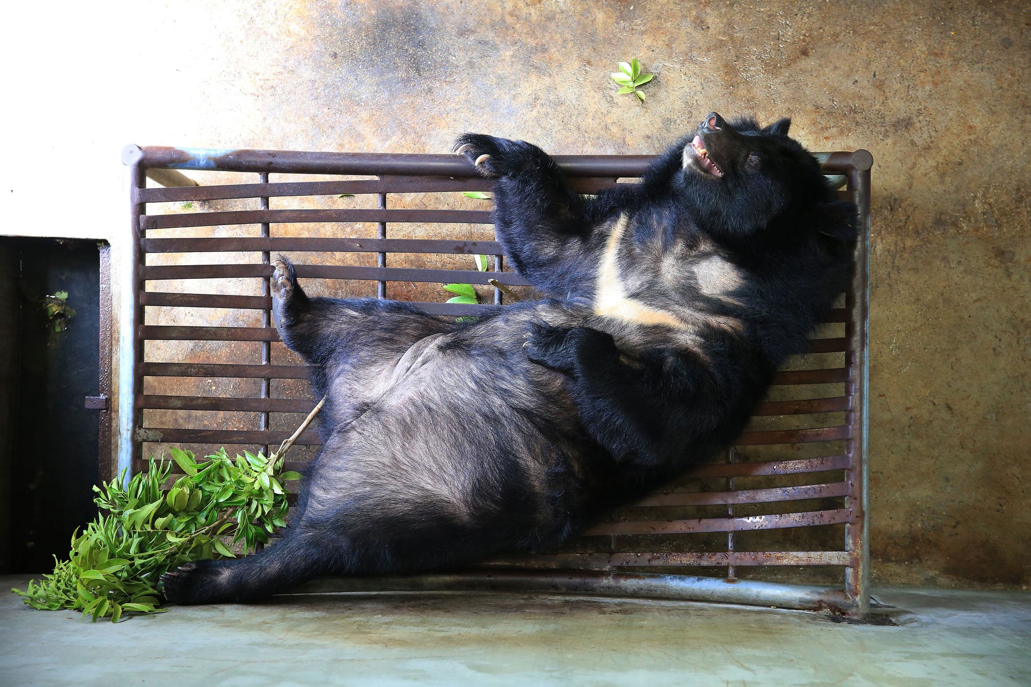 科學家想研究冬眠的熊是如何維持全身的肌肉量。圖為一隻亞洲黑熊,經獲救後躺在越南熊救援中心(Vietnam Bear Rescue Centre)的留置欄。因中國有熊膽入藥治病的想法,使得越南熊膽業與黑熊非法養殖場曾十分猖獗,圖攝於2018年7月。