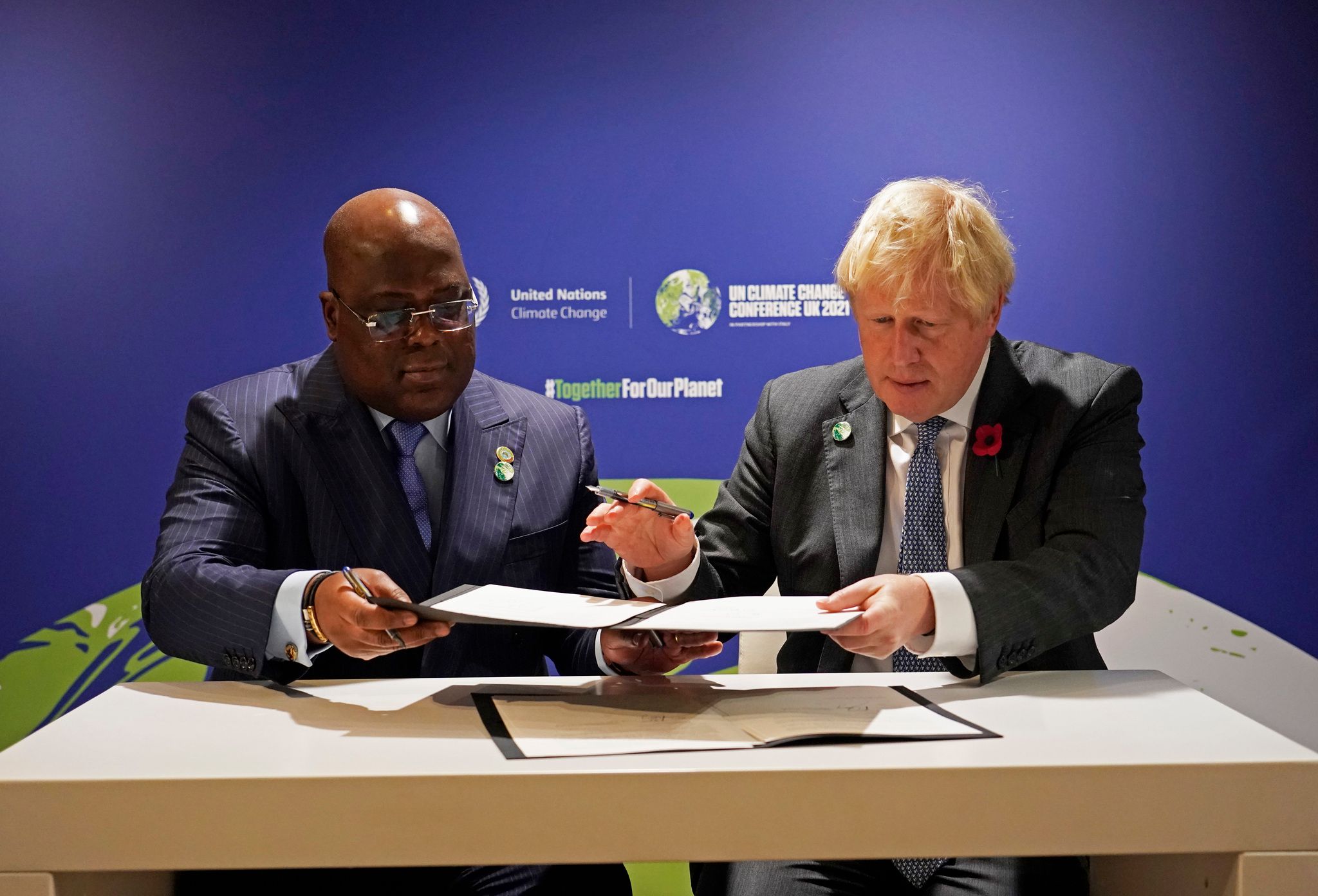 圖為剛果民主共和國總統齊塞克迪(圖左)與英國首相強生(Boris Johnson,圖右),兩人在2021年11月2日的第26屆聯合國氣候峰會上簽署一項保護剛果森林的協議。