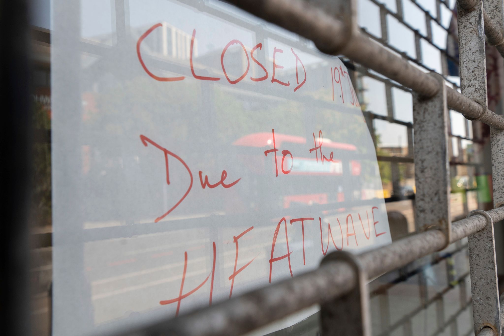 因這次的熱浪導致部分地區氣溫過高,不少店家及在戶外擺攤的攤販因此決定暫停營業。圖為英國倫敦街上暫停營業的店家告示。