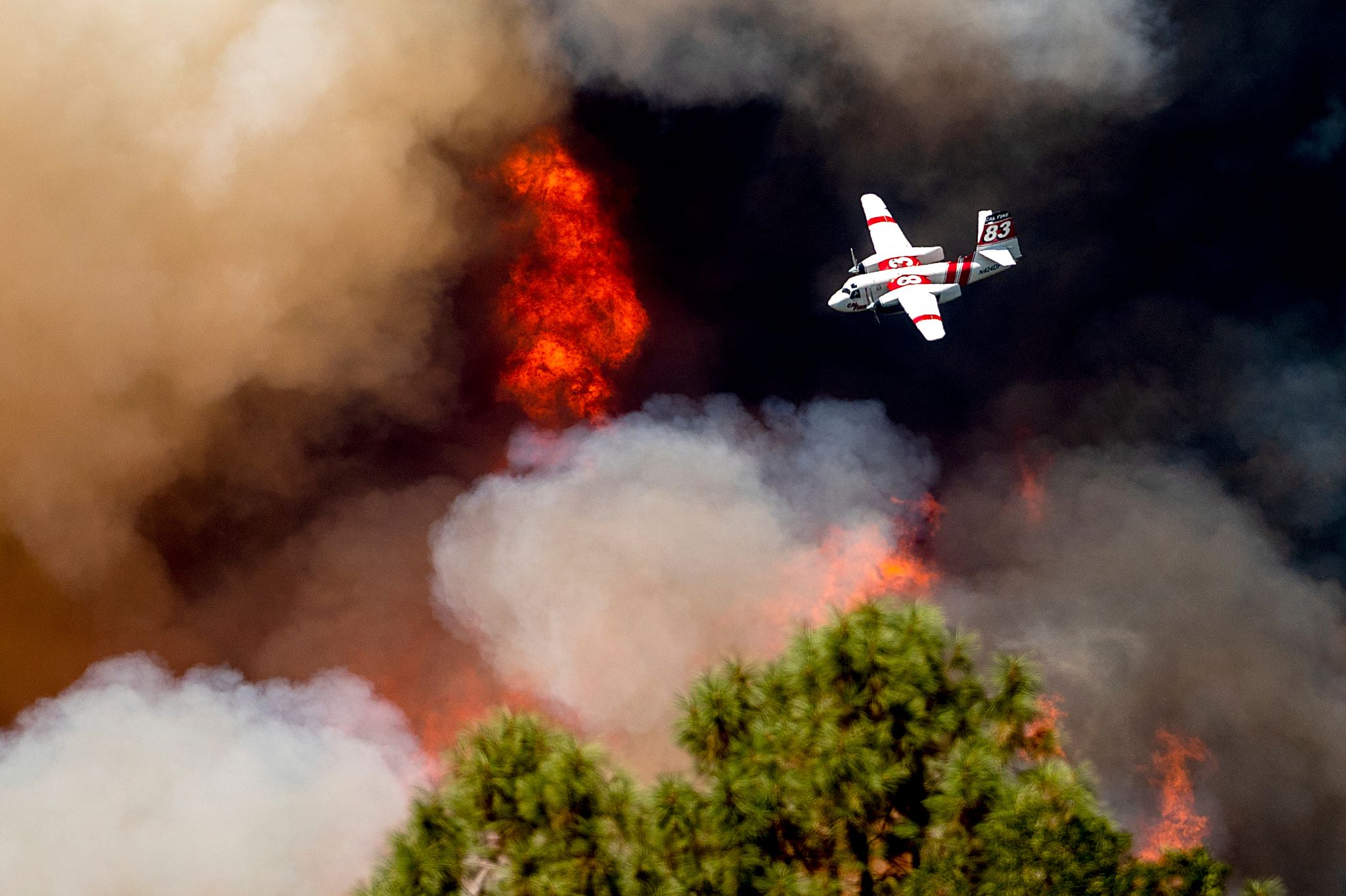 美國加州優勝美地發生橡樹大火,至今已經燒掉超過18000英畝的土地。圖為消防人員駕駛飛機準備灑水試圖撲滅部分地區火勢。