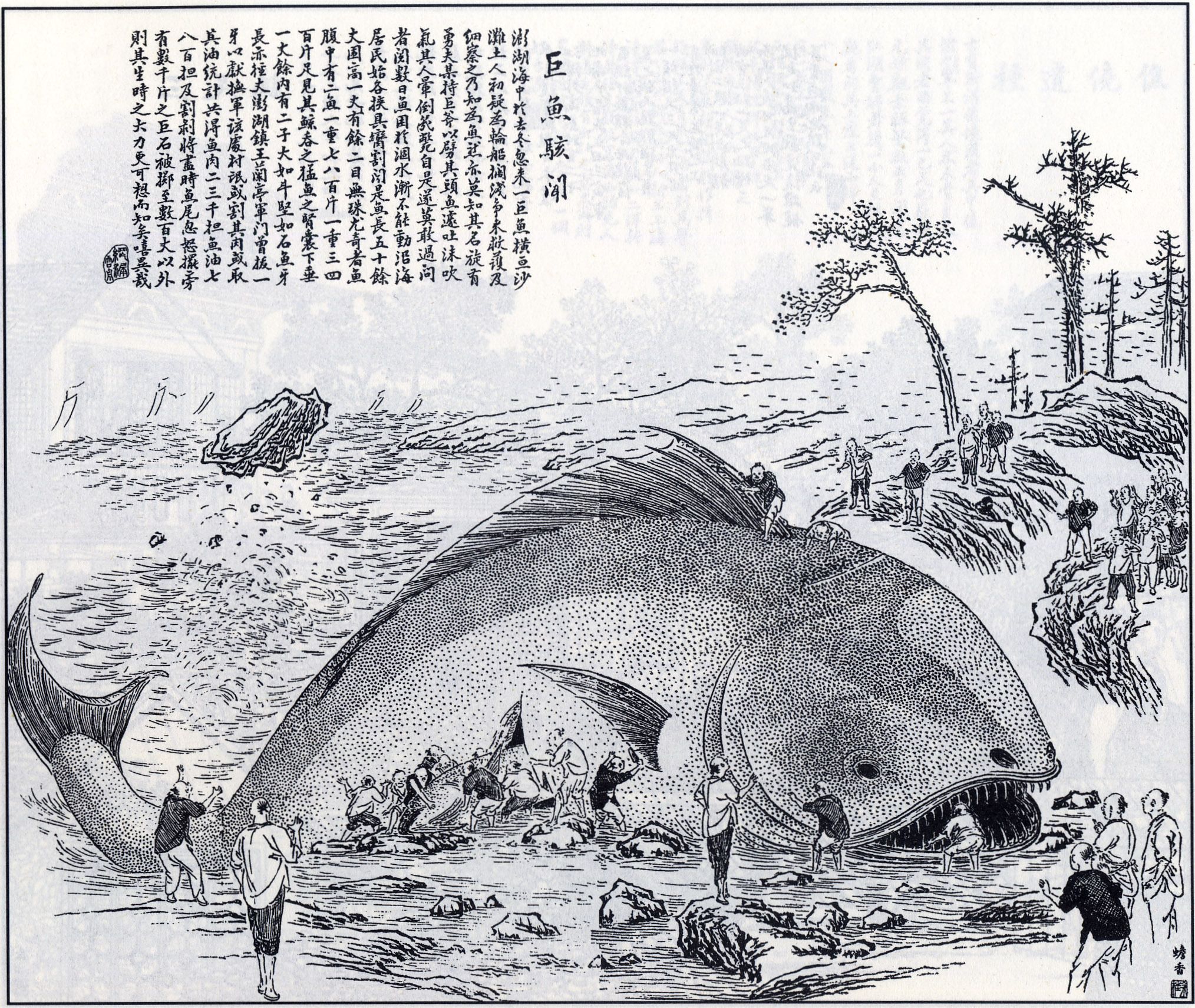 清末澎湖海邊也曾發現鯨魚擱淺,人們還在其腹中發現兩隻百來斤的大魚。在割肉取油時,魚尾突然甩動,將數千斤的巨石擲到百丈之外,成為人們口耳相傳的巨魚駭聞。