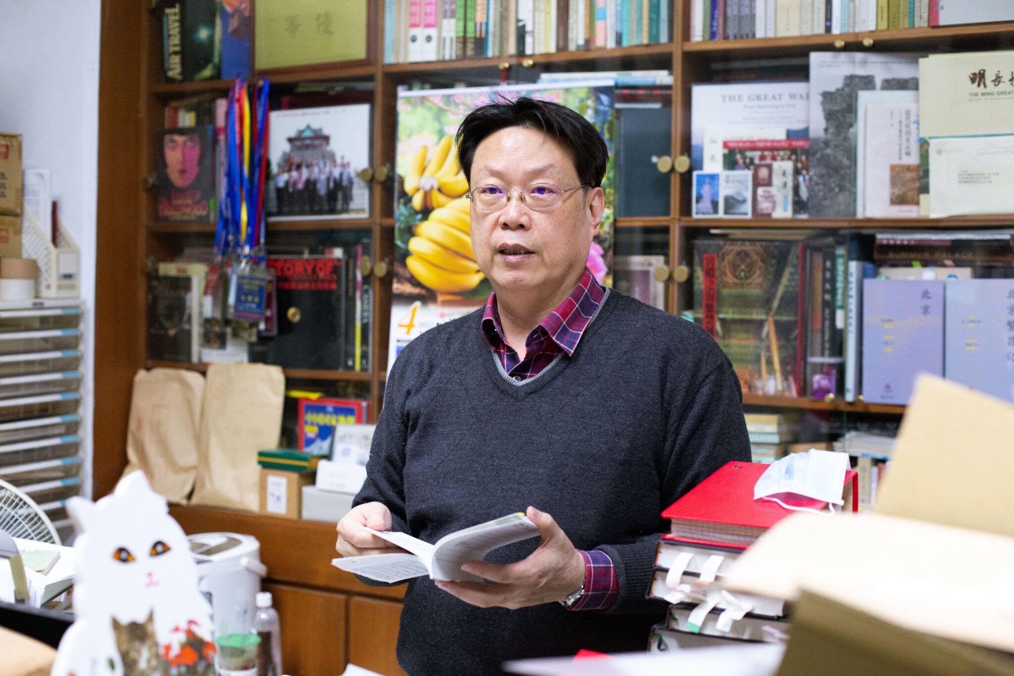 邱仲麟研究員的辦公室充滿各式文獻史料,研究主題遍及明清時期的都市、醫療、花卉、西洋鏡、公共衛生、軍事防禦、鯨豚擱淺史等。