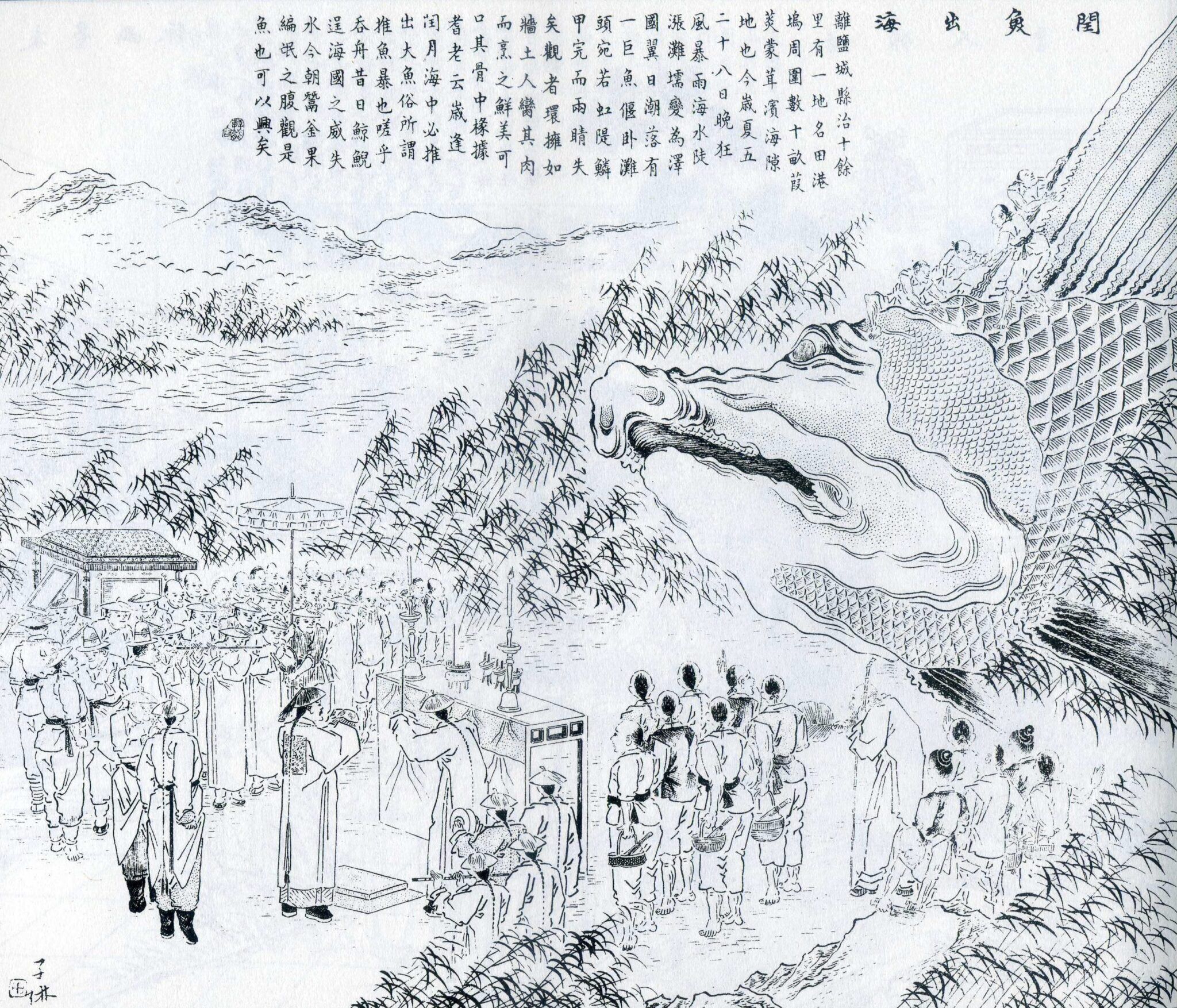 清末「閏魚出海」圖文記事。老人們相傳每逢閏月,海中總有大魚被沖上岸,因為大魚平時興風作浪、打翻漁船、以人為食,如今才會擱淺,成為人們的美食。