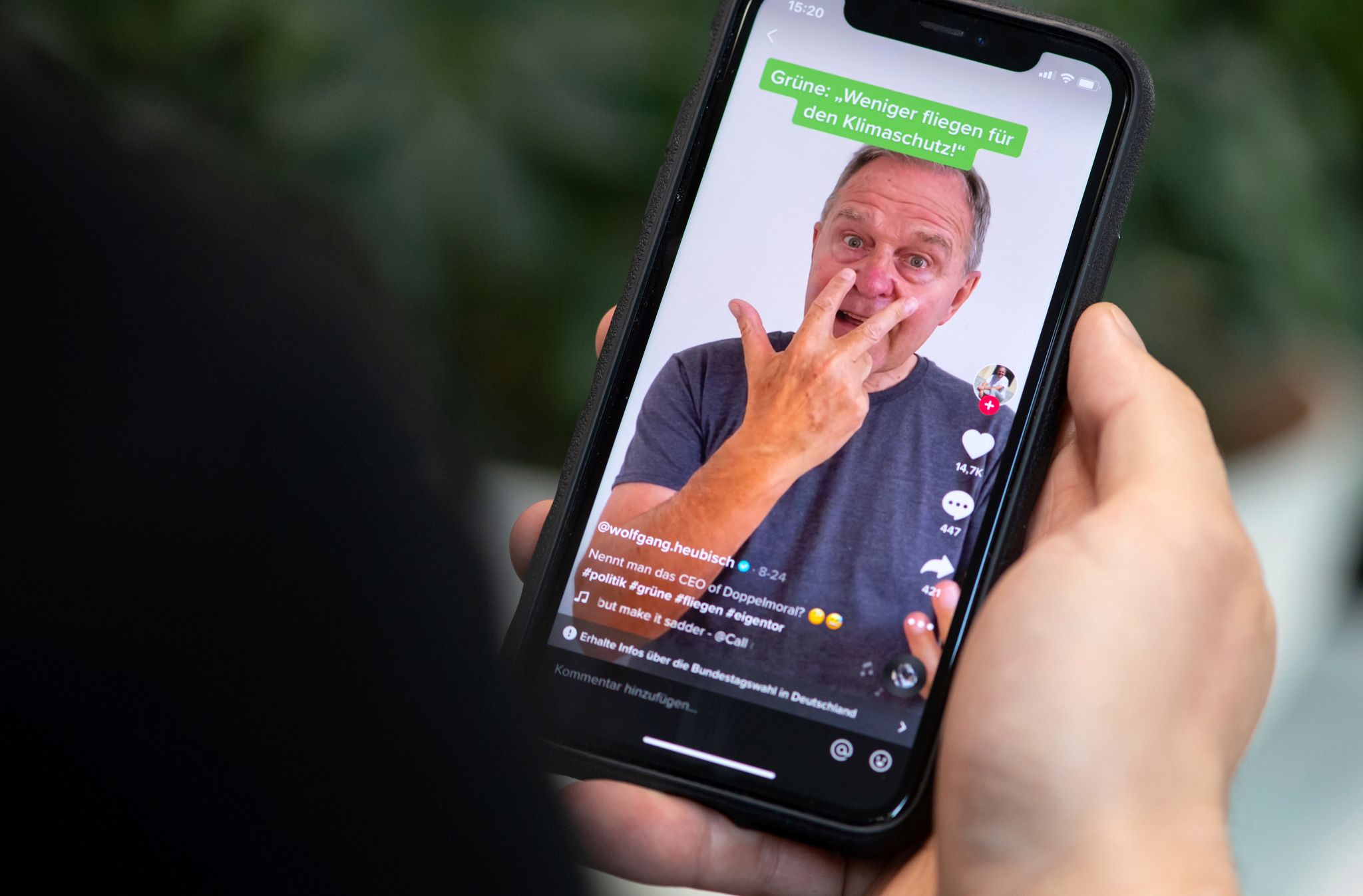 Tiktok的短、炫、快等特色,也成為政治人物用來操作選舉的工具之一。圖為一名德國民眾拿著手機,播放著德國自由民主黨(FDP)政治人物賀比奇(Wolfgang Heubisch)的Tiktok影片(示意圖)。