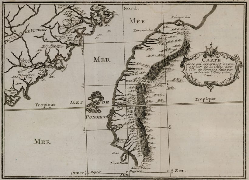 圖為清朝康熙皇帝委託歐洲傳教士所繪製的《皇輿全覽圖》中的〈福建省圖〉,圖中右下角繪有清朝時期的臺灣。