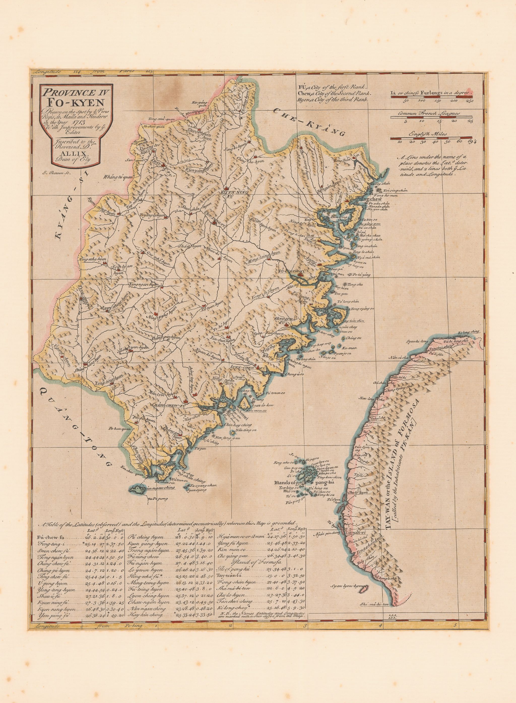 至於這幅〈福建省圖〉也是唐維爾地圖相關延伸版本。它收錄在1738年於英國倫敦出版的杜赫德《中華帝國記述》英譯本裡,是中國各省分圖的第四幅,由英國地圖雕版師鮑恩(Emanuel Bowen)製作。其內容大致與法文版相同,所以也是源自《皇輿全覽圖》的資訊,只是文字全部改成英文,並在左下角條列福建省各主要城市的經緯度數字,而在標題下方,則多註明了「Inscribed to the Reverend Dr. ALLIX, Dean of Ely 」(題獻給伊利座堂主任牧師阿里克斯)等,應是製圖者給予其贊助或支持者的表揚回饋。