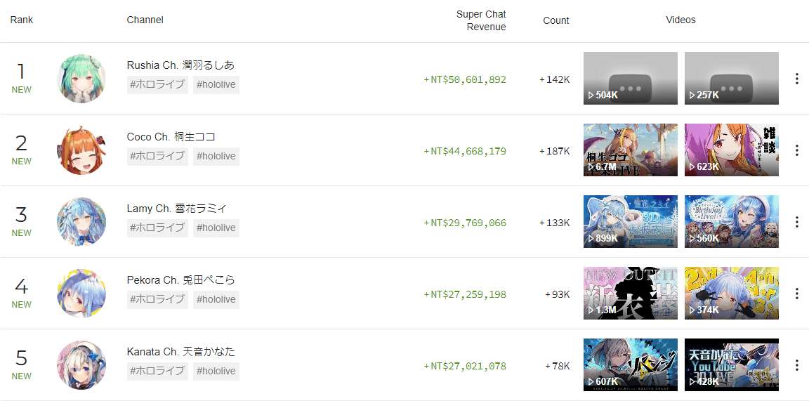 圖為2021年超級留言(Super Chat)的年度排行榜,前5名皆為Hololive旗下的Vtuber。