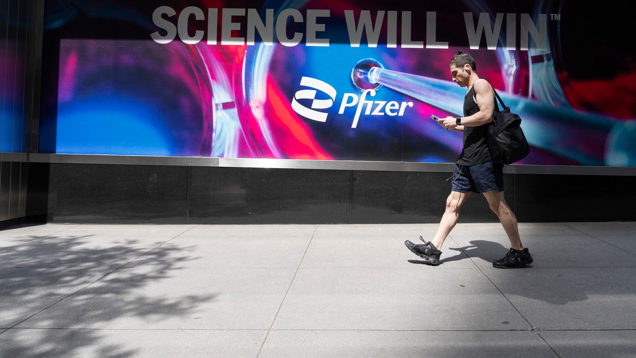 一名身穿運動服的路人經過輝瑞公司總部外張貼的廣告看板,上面寫著「科學將獲得勝利」。圖攝於2022年5月,美國紐約。