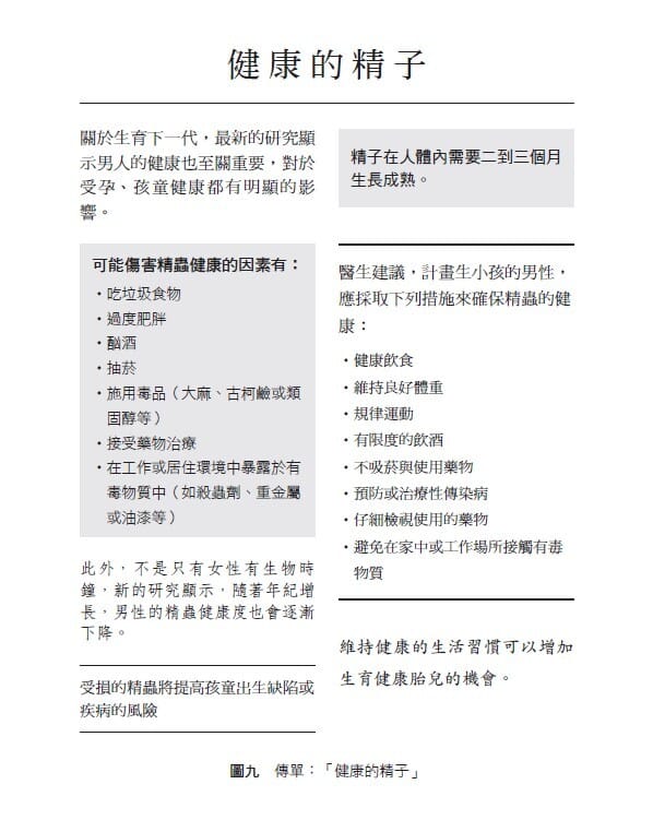 我希望找到一本易於病患閱讀、有關父體效應的小冊子,結果只在CDC網站找到短短一頁的男性備孕須知,而且這一頁未包括精子若受損可能對孩子造成風險的詳盡資訊。所以我自己設計了小傳單。