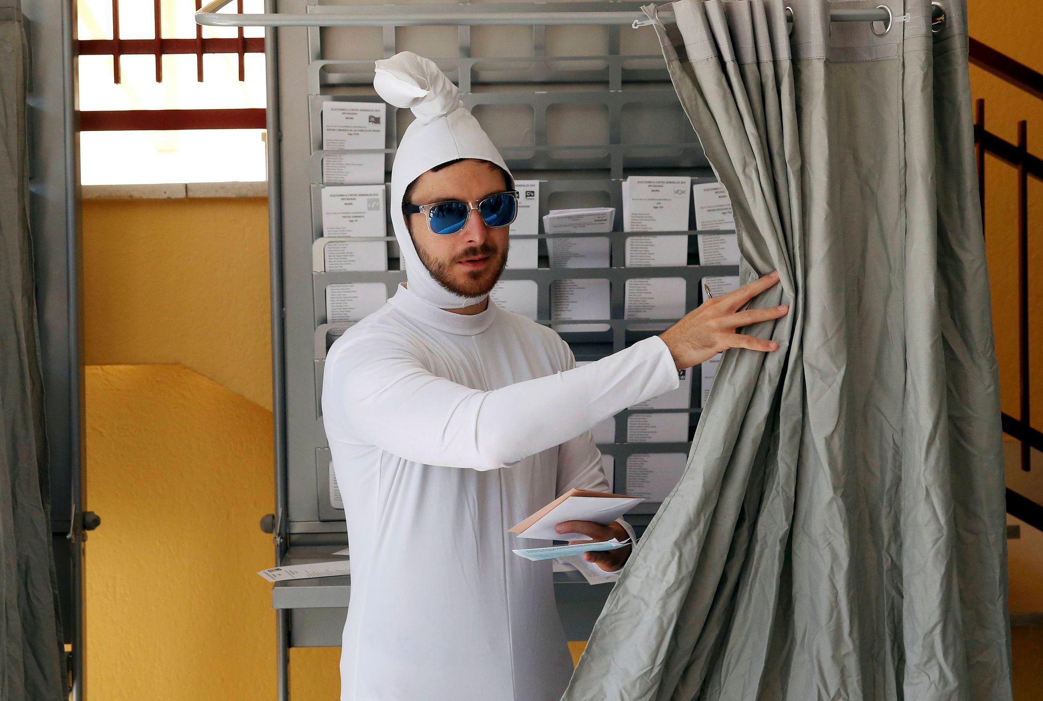 圖為一名男子在西班牙大選的投票站中,扮演成精子的模樣。