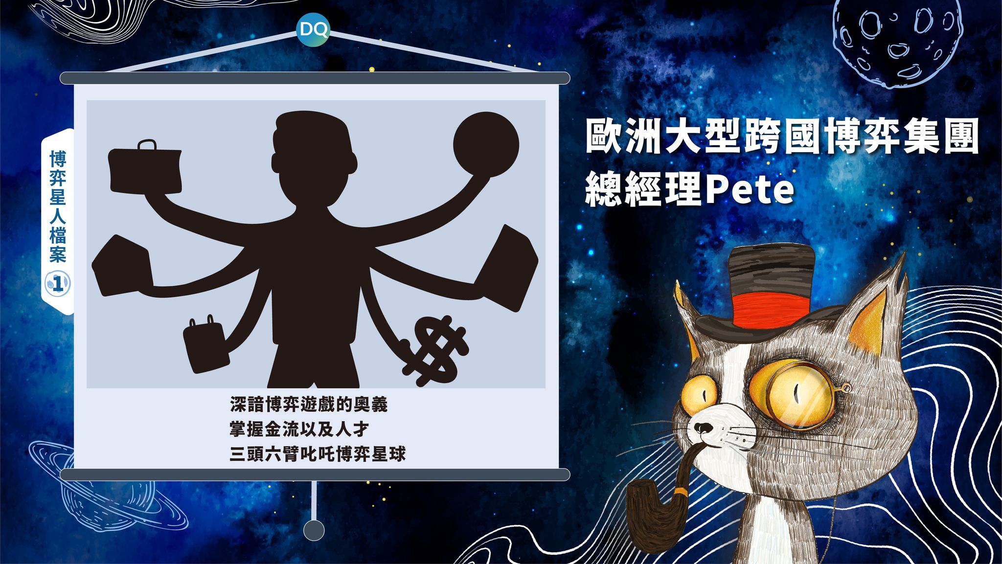 【DQ情報員日誌】剛降落博奕星球,我就感受到這個星球所蘊含的能量,緣溪行,忘路之遠近,迎面走來一位有著三頭六臂的博奕星人,他深諳博奕遊戲的奧義,掌握金流以及人才,叱吒博奕星球的厲害角色:Pete 。我不敢怠慢,趕緊上前蒐集情報,喵。