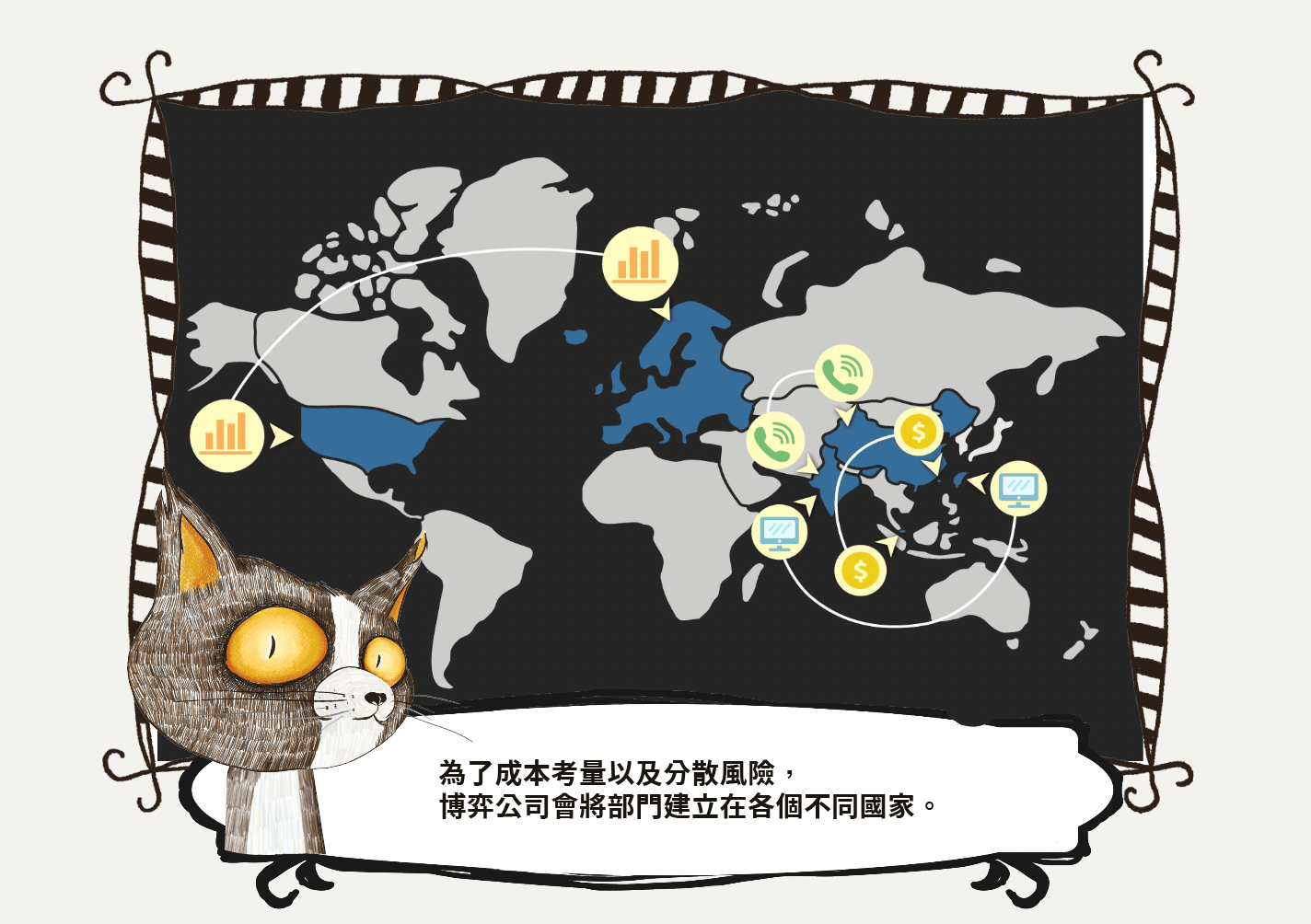 其實,在哪裡開發或修改遊戲,對我們(公司)來說都是一樣的。因此,我們會針對不同的工作任務與需求,將任務移往成本較低的地區或國家執行,尤其是「人的成本」,例如台灣的工程師平均能力好,但薪資要求又相較歐美低,所以有很多中國或東南亞的線上博弈平台,不分合法與否,多會將網站維運相關的人力往你們(台灣)那裏擺。其實這跟傳統製造業的邏輯差不多,就像Apple產品的所有部件生產,其實都來自不同國家。