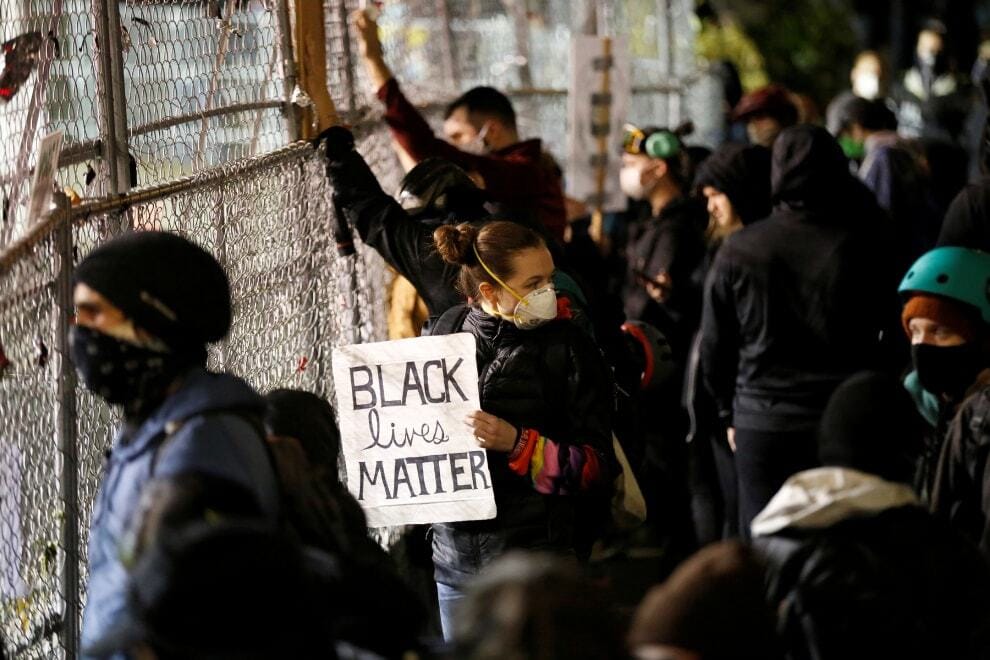 2020年5月25日,在明尼蘇達州的明尼亞波利斯(Minneapolis, Minnesota),一名非裔男子佛洛伊德(George Floyd)因為被一名白人警察用膝蓋壓頸而窒息身亡,該事件引起美國各地對種族歧視的不滿,並因此走上街頭。畫面攝於奧勒岡州波特蘭市,2020年6月13日。