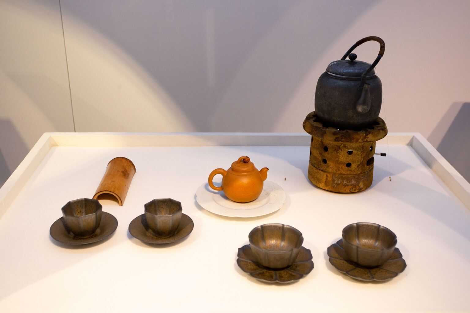 臺灣茶藝使用的茶具相當多元,有日本的銀壺、宜興的段泥壺、臺灣現代陶藝商品(風爐、杯與杯托)。圖|研之有物(茶具所有|余舜德)