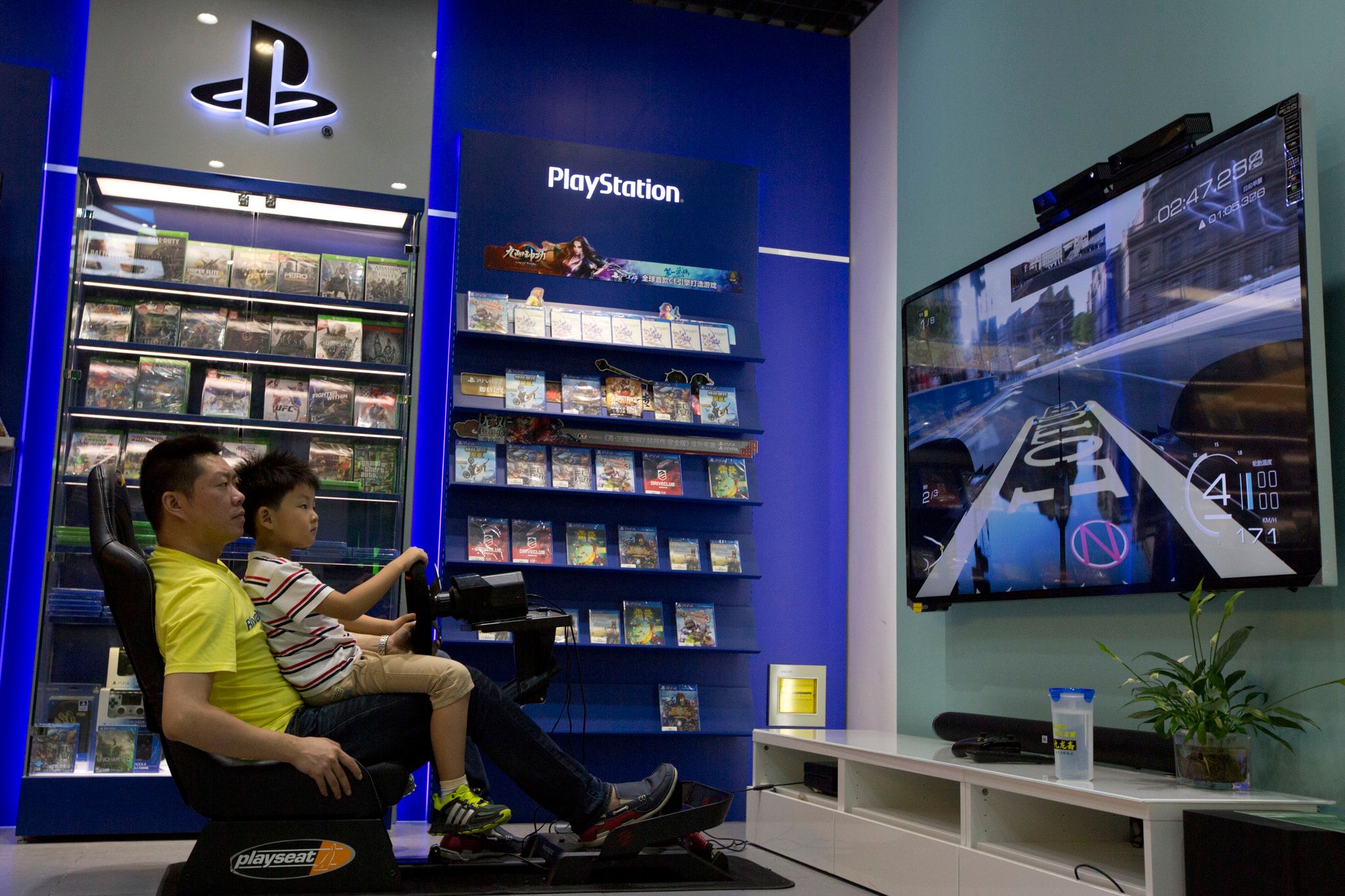 中國對未成年的電玩玩家加強管制力道,盼能讓孩童遠離「精神鴉片」的毒害,但也讓國內電玩業者膽戰心驚。圖為中國北京電玩店店員帶著小孩玩賽車遊戲。