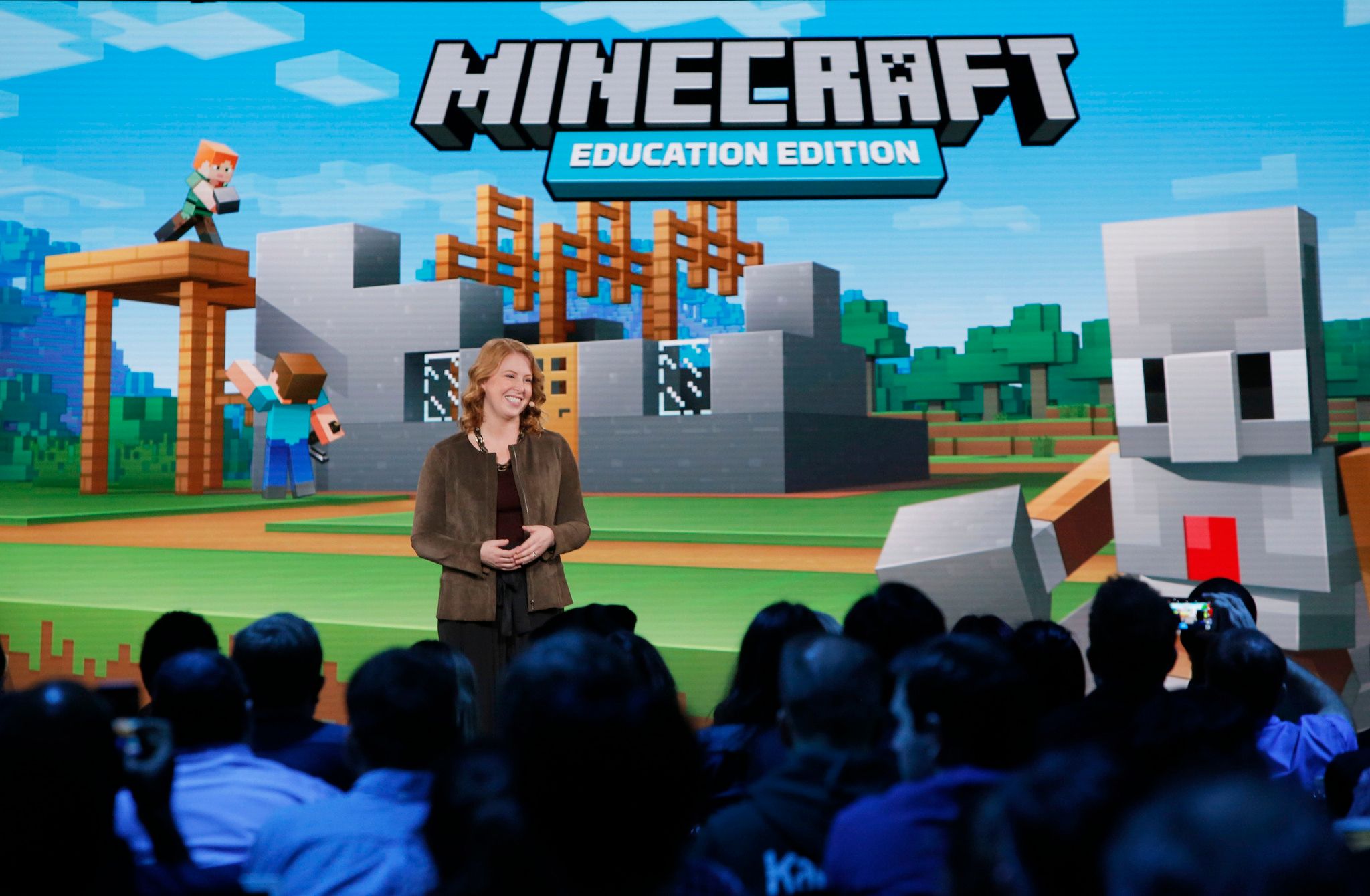 Minecraft不僅帶給人們消遣,也成為教育學者們方便使用的教材。圖為2017年,Minecraft的總監華倫史壯(Deirdre Quarnstrom)在紐約的微軟教育年會上,發布關於Minecraft教育版的消息。