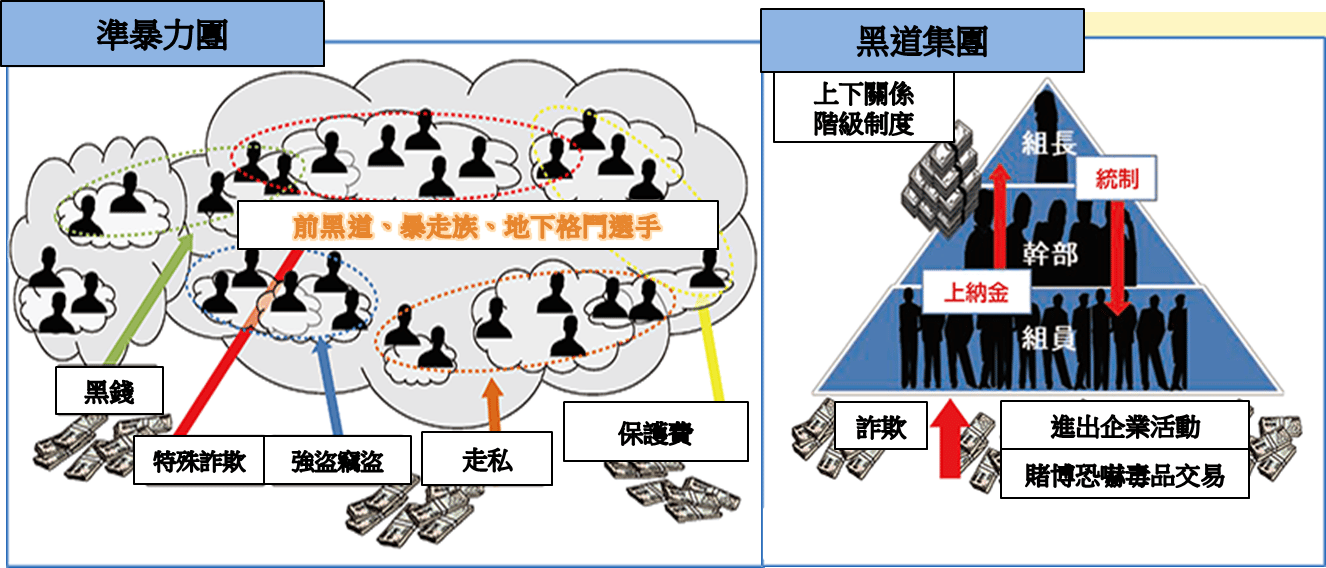 1992年日本全面掃黑實施《暴力團對策法》,規定只要加入黑道集團(暴力團)便無法申請銀行戶頭、信用卡、保險、手機門號。但是「準暴力團」在狹義的定義上,並不等於暴力團黑道集團,兩者雖然都是由不良份子組成,專門從事違法活動,但兩者最大的差別在於是否有「系統化」。
