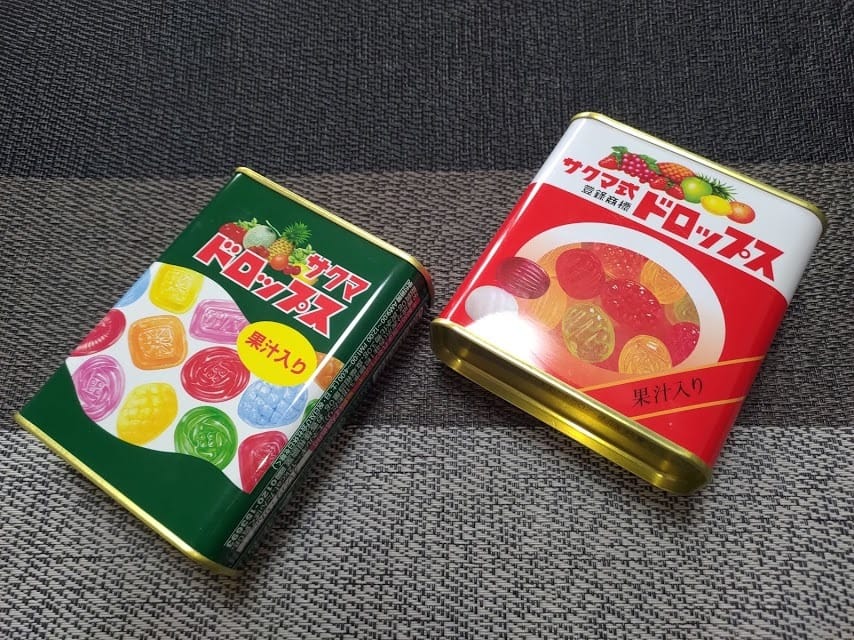 綠色包裝為サクマ製菓,紅色包裝為佐久間製菓。兩間為同一個創始人,現為不同的公司。