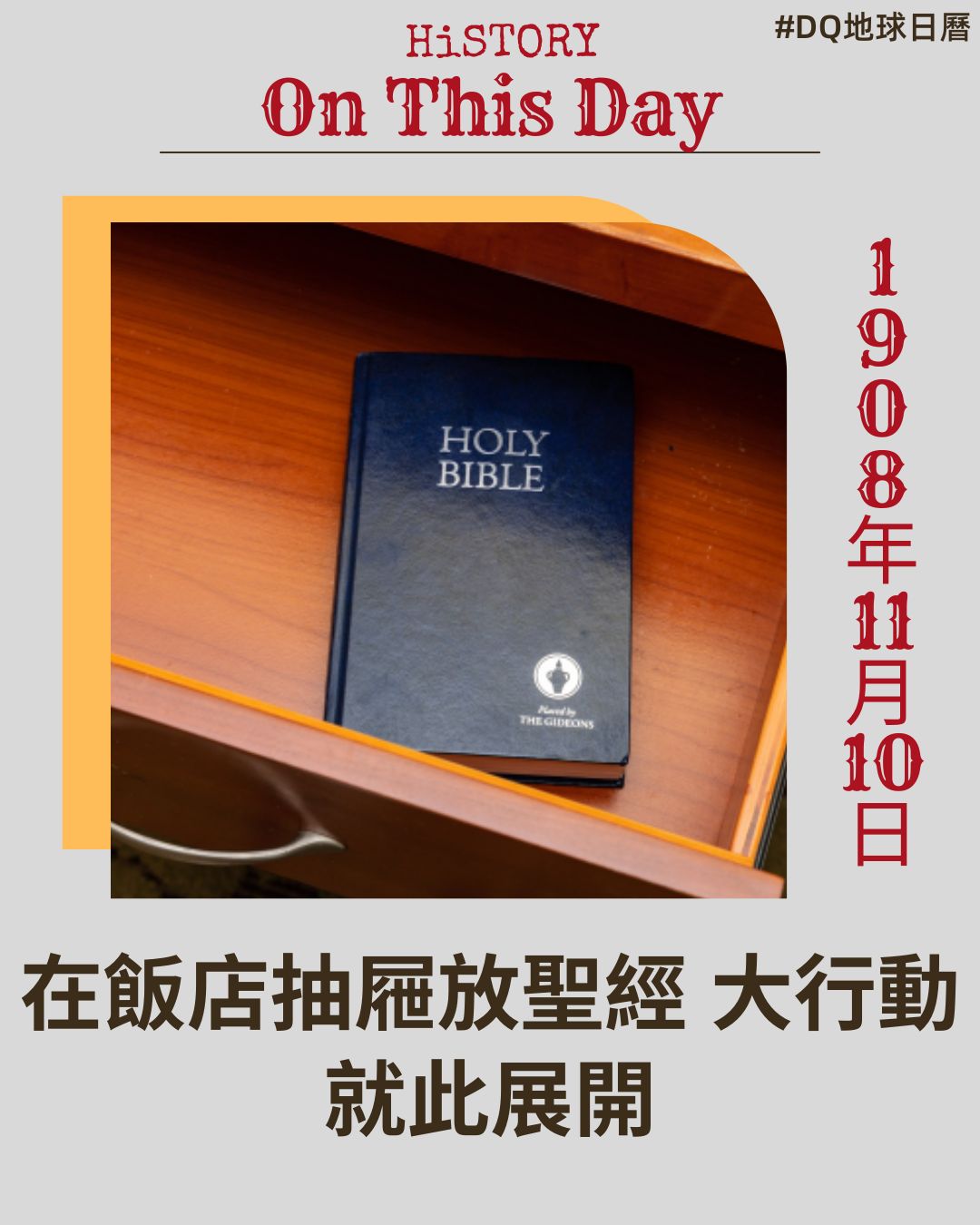 為什麼住飯店時,很常會在抽屜裡看到一本聖經呢?這不是飯店為了驅邪,而是一百年前有兩個男人,和飯店經理求來的。1908年11月10日,福音派基督教組織「國際基甸會」,將二十五本聖經放到美國西部蒙大拿州的高級飯店的抽屜裡。