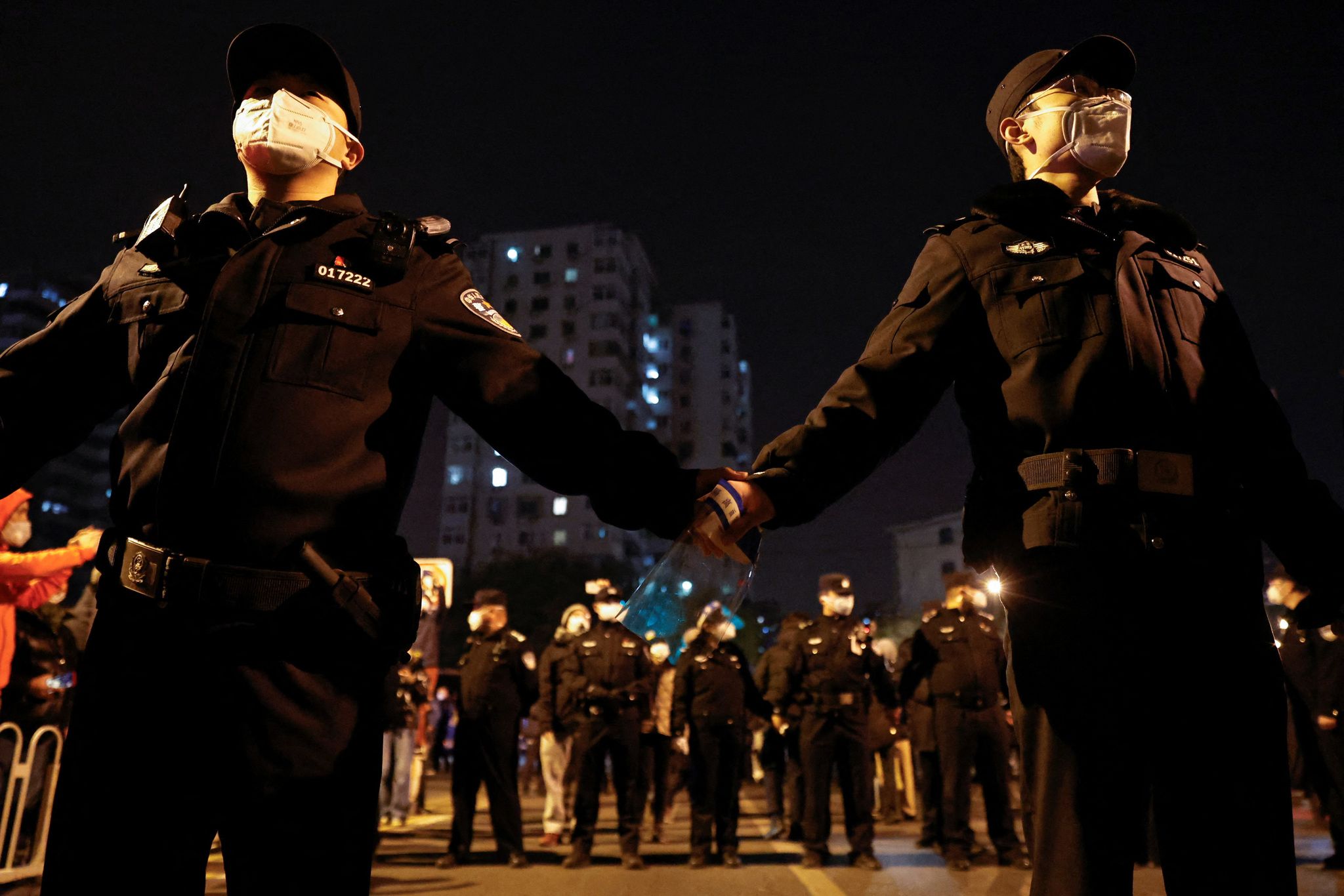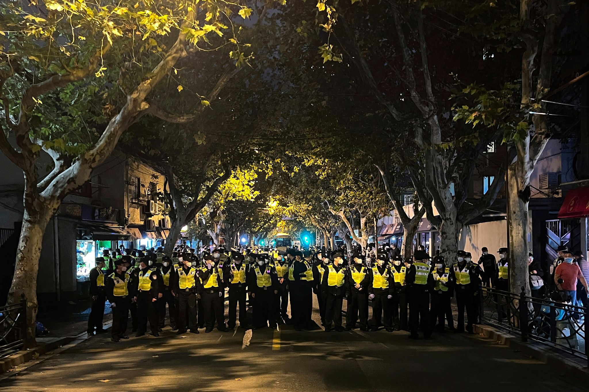 路透社 / 達志影像null2022 年11月27日,週日下午,上海居民齊聚街頭,抗議中國嚴格的防疫清零政策,警察封鎖了抗議者在上海聚集的地點。(上海,美聯社)