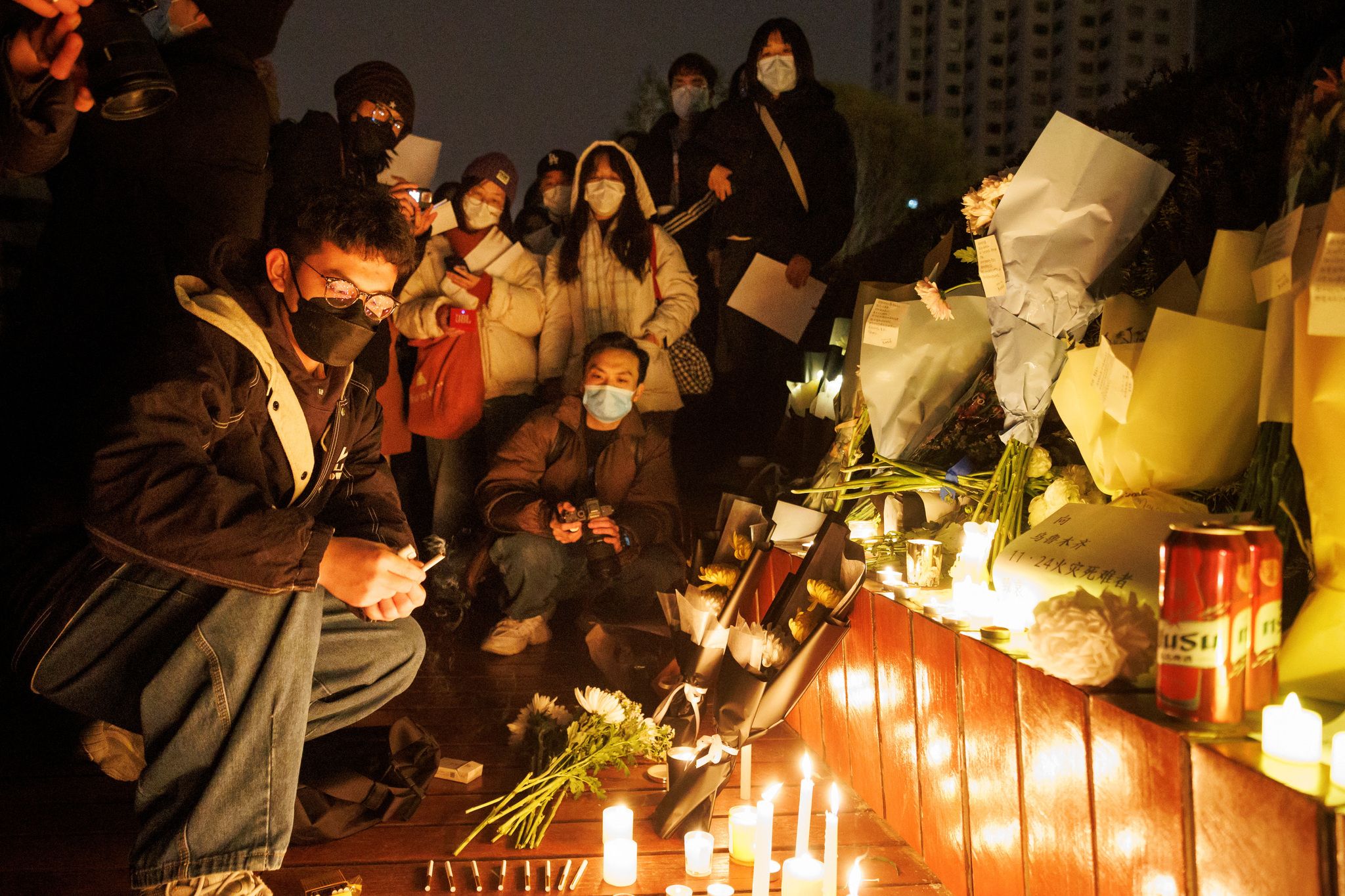 11月27日,北京的人民聚集在烏魯木齊火災遇難者的紀念活動中守夜(路透社,北京)