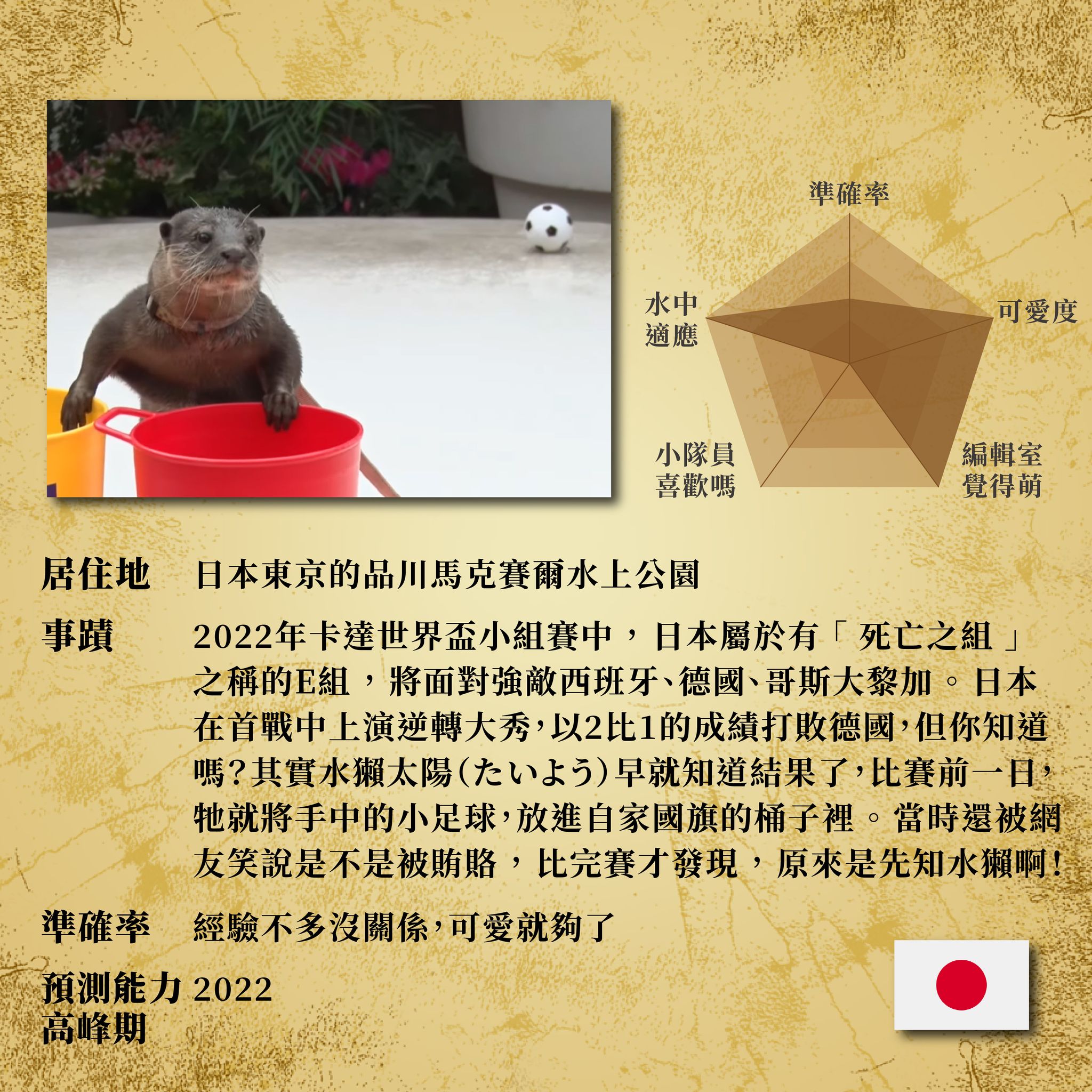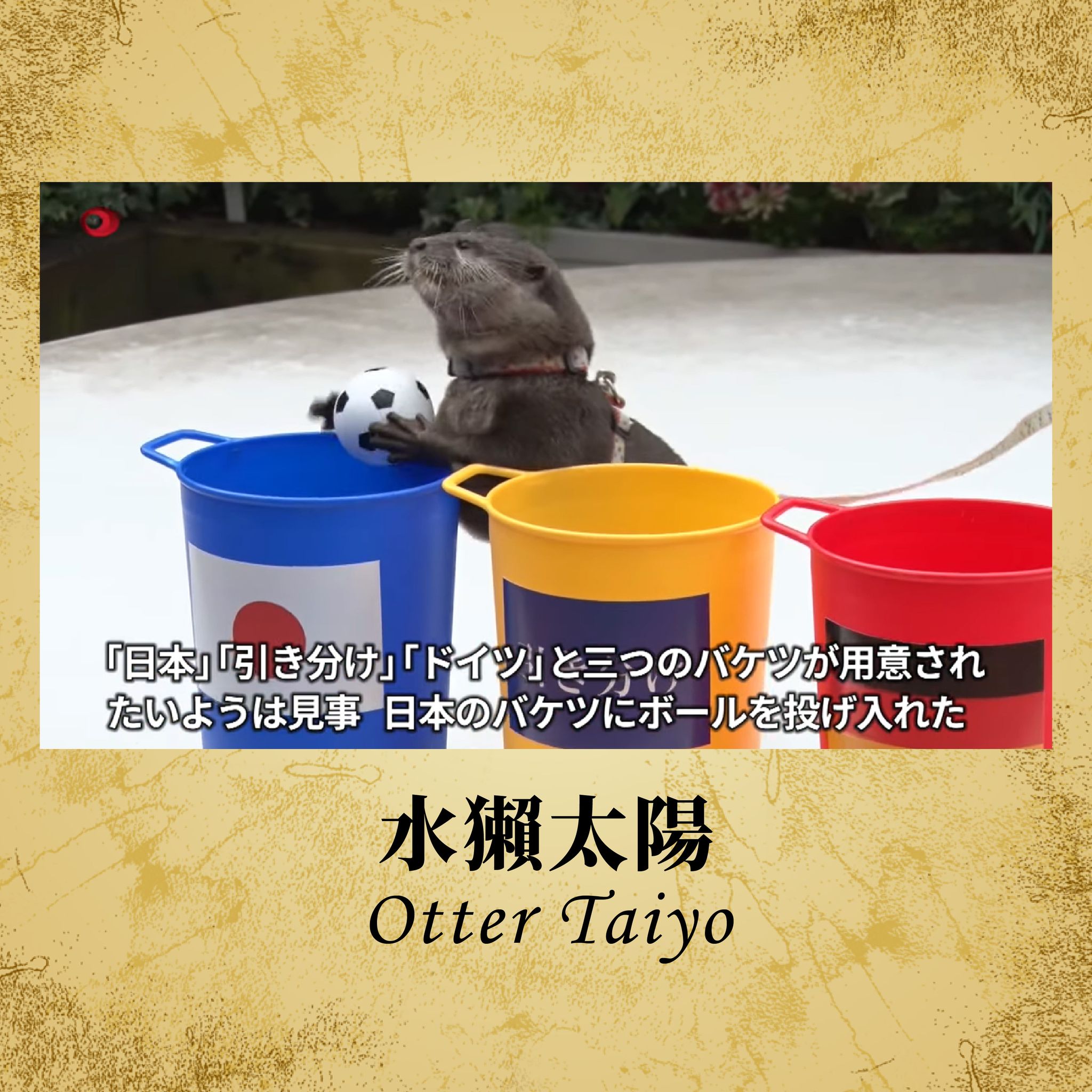▲11月23日,日本與德國足球比賽前,東京品川水族館(Maxell Aqua Park Shinagawa)準備了三個顏色的水桶,分別代表了:日本、德國與平手,並交給水獺太陽(たいよう)一顆迷你足球,看牠會將球投入哪一個桶子來預測比賽結果。水獺太陽接到工作人員丟給牠的球后,在場上繞了一下,毫不猶豫地將球投入象徵日本的藍色桶子。