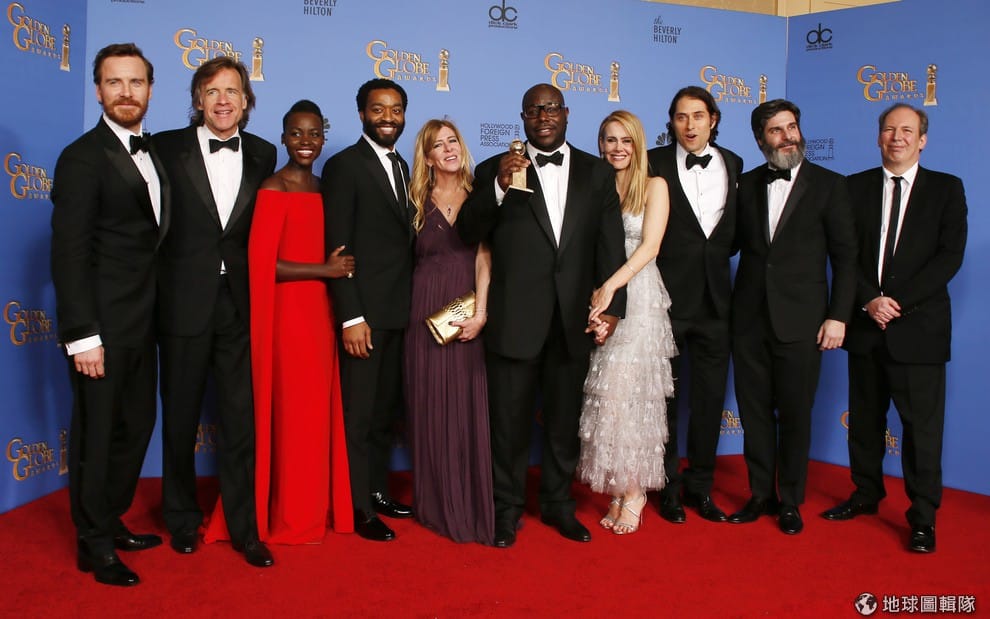 照片中《自由之心》(12 Years a Slave)的導演史蒂夫麥奎因(Steve McQueen)手拿獎盃,和演員開心大合照。