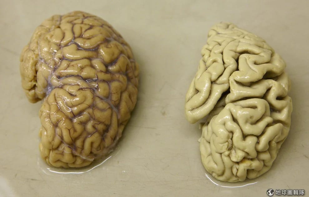 照片中左邊是正常大腦,右邊是患有阿茲海默症的大腦。