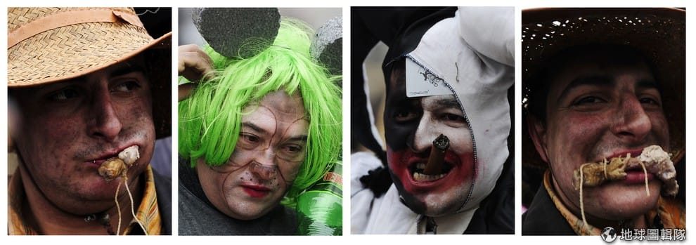 一群遊行者把臉全都塗白,穿上黑白色的衣服在隊伍中走著。