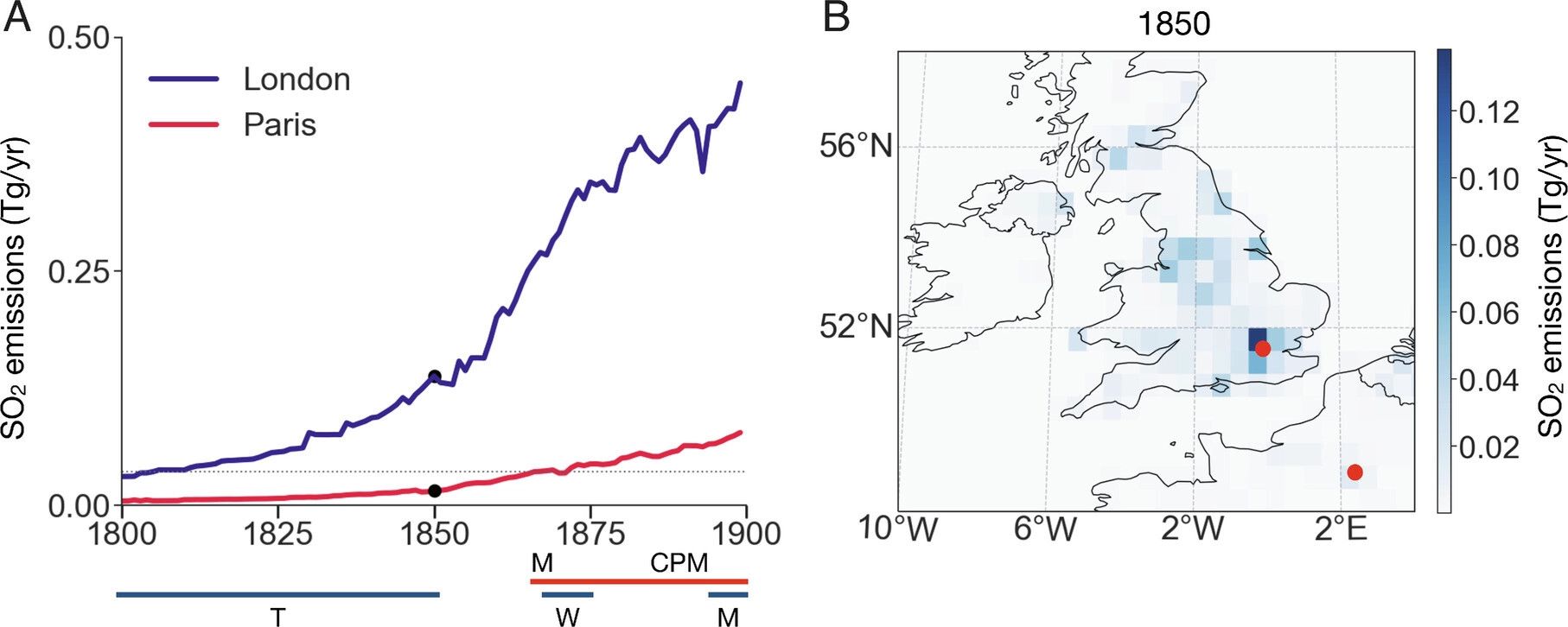 B圖為1850年二氧化硫排放量位置分布圖。紅點為主要排放量,分別集中在英國倫敦以及法國巴黎。