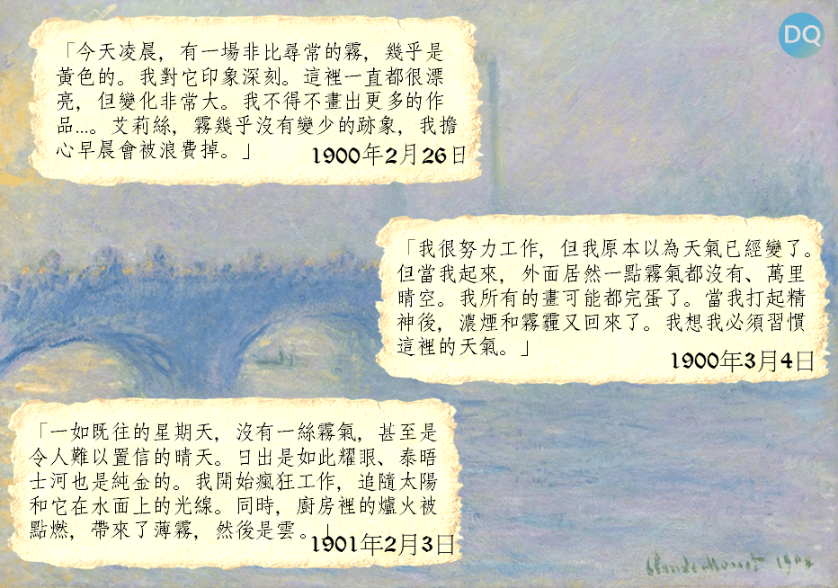 1889年至1905年間,莫內旅居英國,因受到倫敦濃霧的獨特景觀吸引,繪製了將近一百多幅霧裡的國會大廈、滑鐵盧橋(Waterloo Bridge)和查令十字橋(Charing Cross Bridge)。倫敦多變的天氣,也帶給莫內許多創作靈感。莫內寫給妻子的信也曾多次提到(參考上圖),當「爐火」點燃後,原本萬里無雲的天空就會出現開始薄霧。