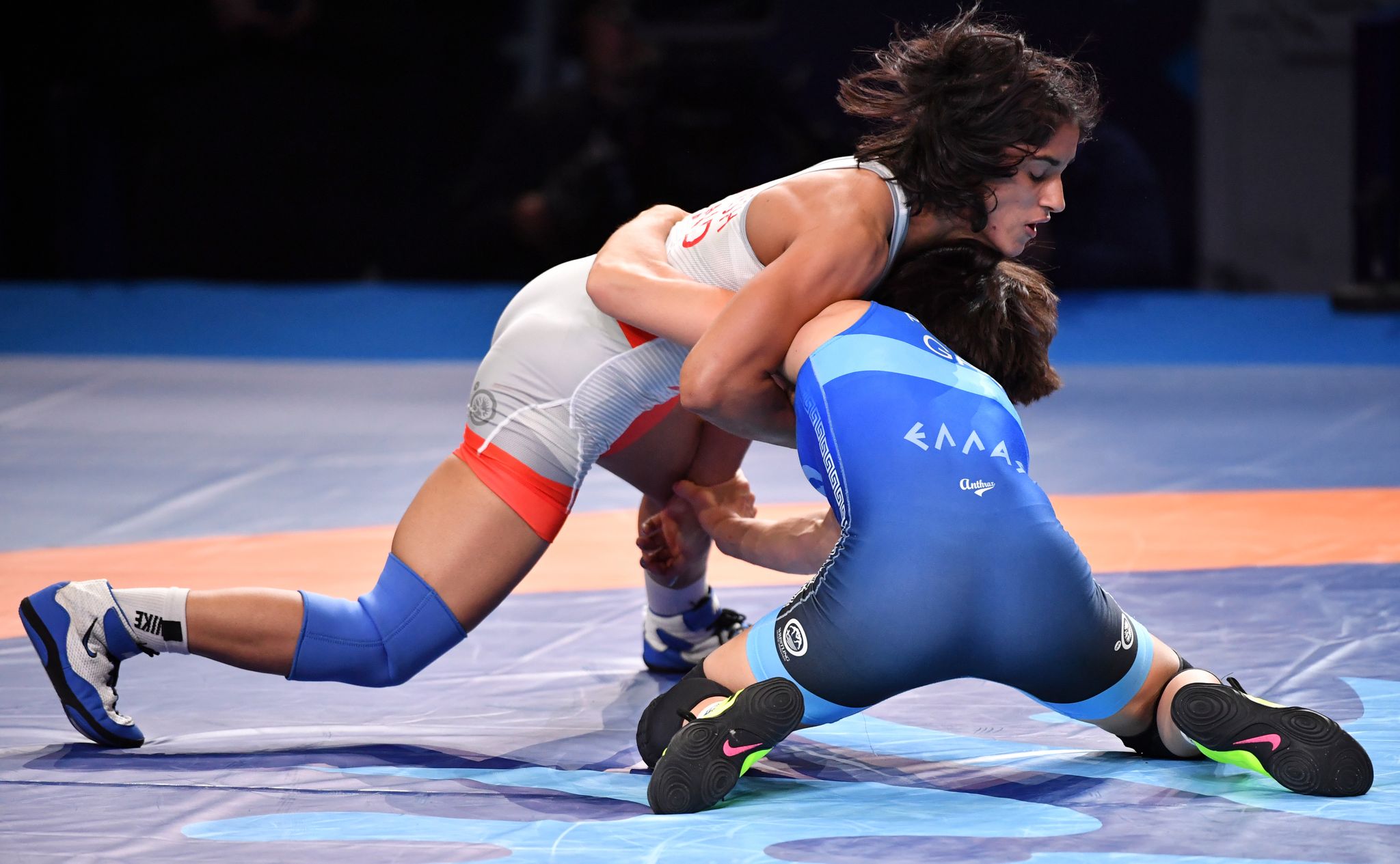 2019 年,世界摔角錦標賽於哈薩克努爾-蘇丹舉行,女子 53 公斤級銅牌由維納什(左)對決來自希臘的瑪麗亞·普雷沃拉拉基(Maria Prevolaraki)。