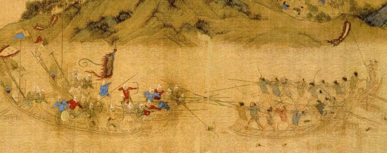 繪於 16 世紀的「倭寇圖卷」,上面畫有明朝官兵與倭寇船隊交戰的畫面。圖源:東京大學史料編纂所