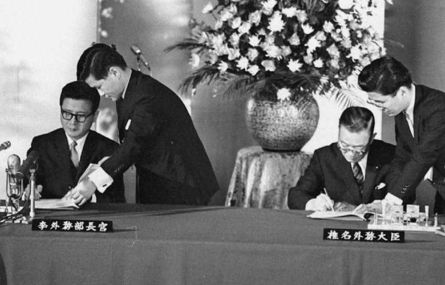 1965年,日韓簽訂《韓日基本條約》,左為韓國外交部長李東元、右為日本外務大臣椎名悦三郎。