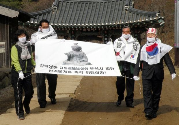 2013年2月28日,日本保守派團體愛國民族運動協會的成員,在浮石寺舉行集會,要求佛像應該要留在韓國。