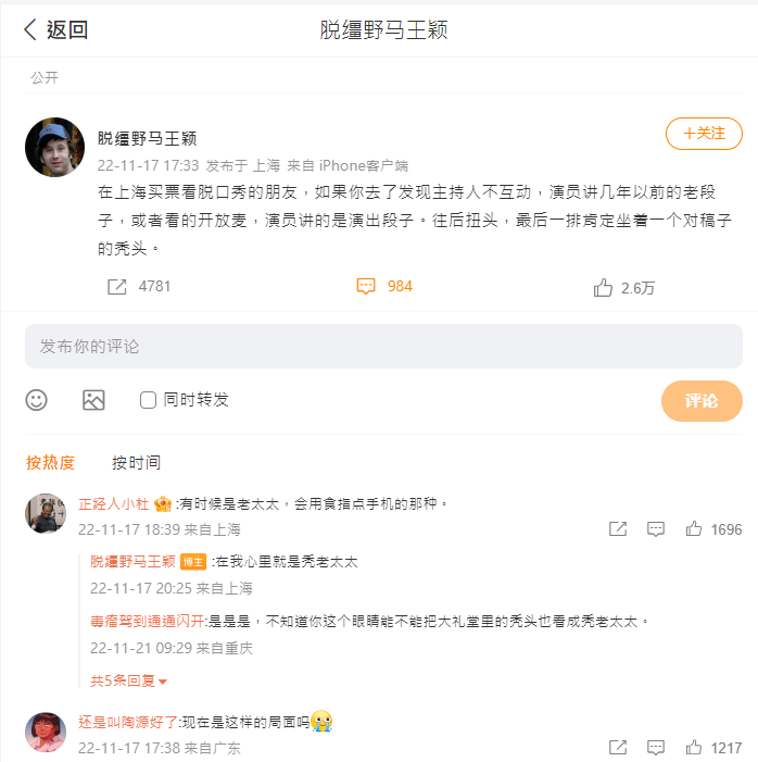 中國社群平台微博博主「王穎格式化」去年11月17日發帖,指「在上海買票看脫口秀的朋友,如果你去了發現主持人不互動,演員講幾年以前的老段子,或者看的開放麥,演員講的是演出段子。往後扭頭,最後一排肯定坐著一個對稿子的禿頭」。
