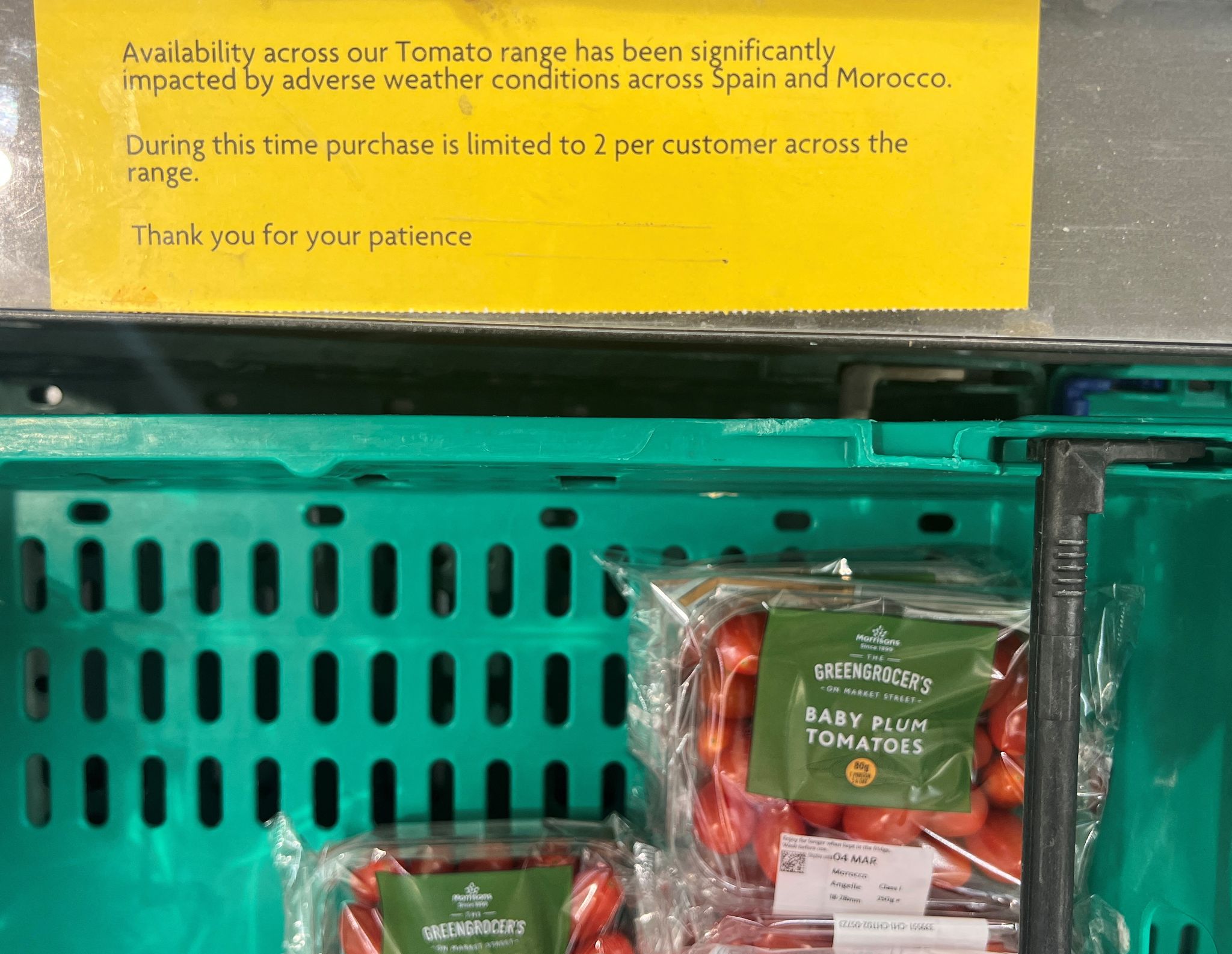 此圖攝於2月27日英國的莫里遜(Morrisons)超市,架上的告示牌寫著:一位顧客限定購買兩盒番茄。
