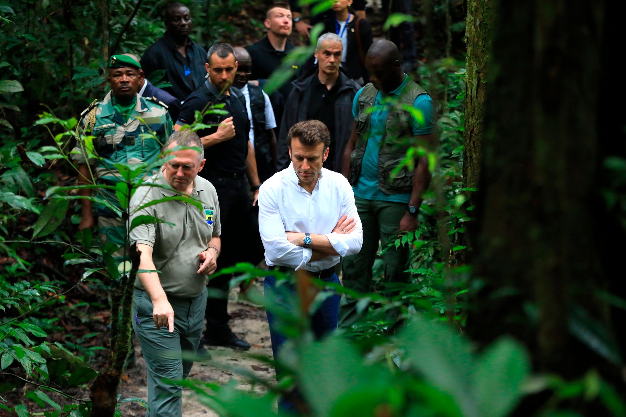 法國總統馬克宏(Emmanuel Macron)在森林水利環境部長懷特(Lee White)的帶領下參觀加彭的雨林。