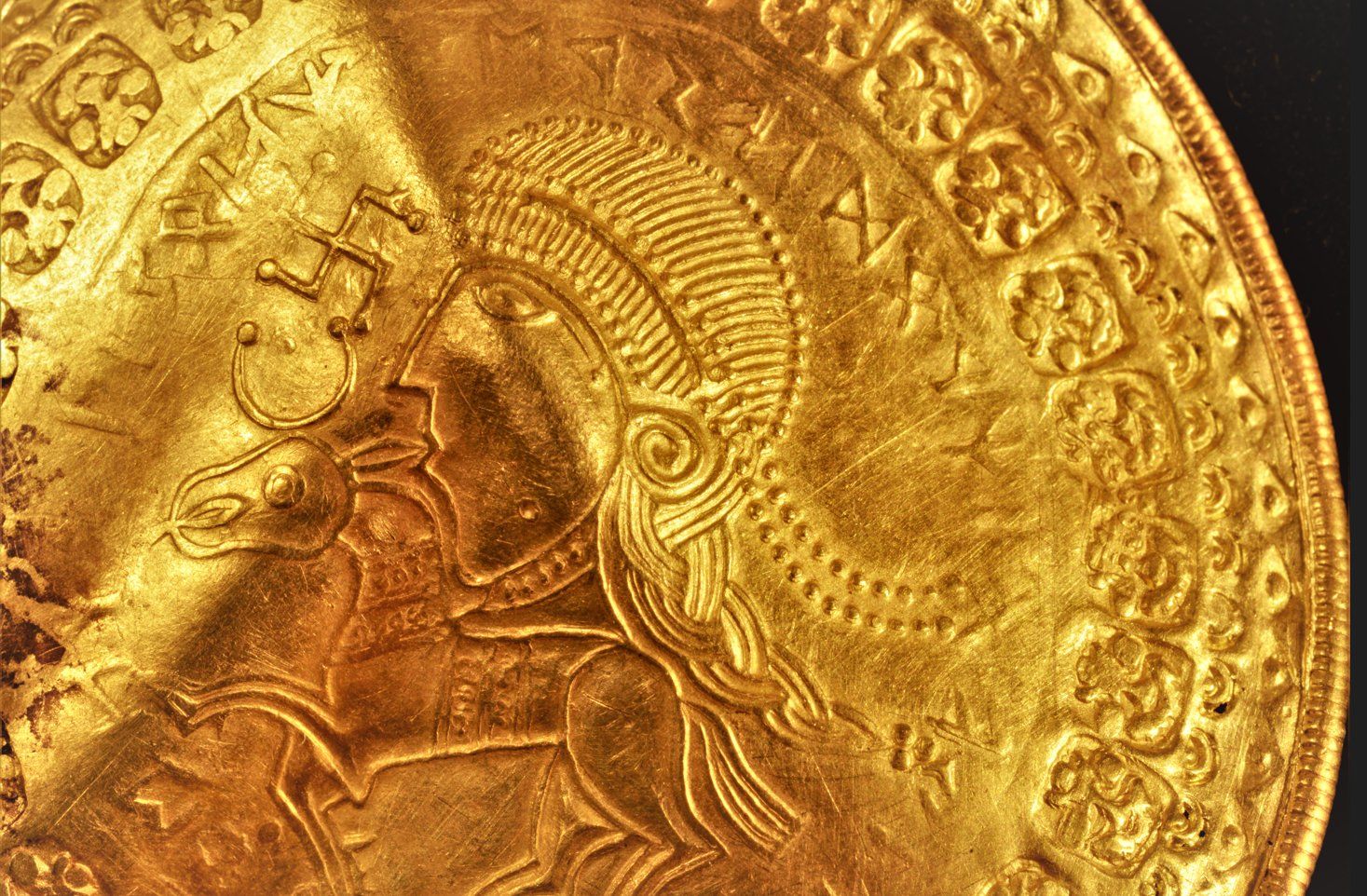 而這個圓盤,事實上是從一批將近一公斤重的黃金寶藏中發現的。這批寶藏在日德蘭半島中部的敏德流村(Vindelev)出土,又被稱為「敏德流的寶藏」。其中有茶碟大小的獎章,和羅馬硬幣製成的珠寶等等古文物。