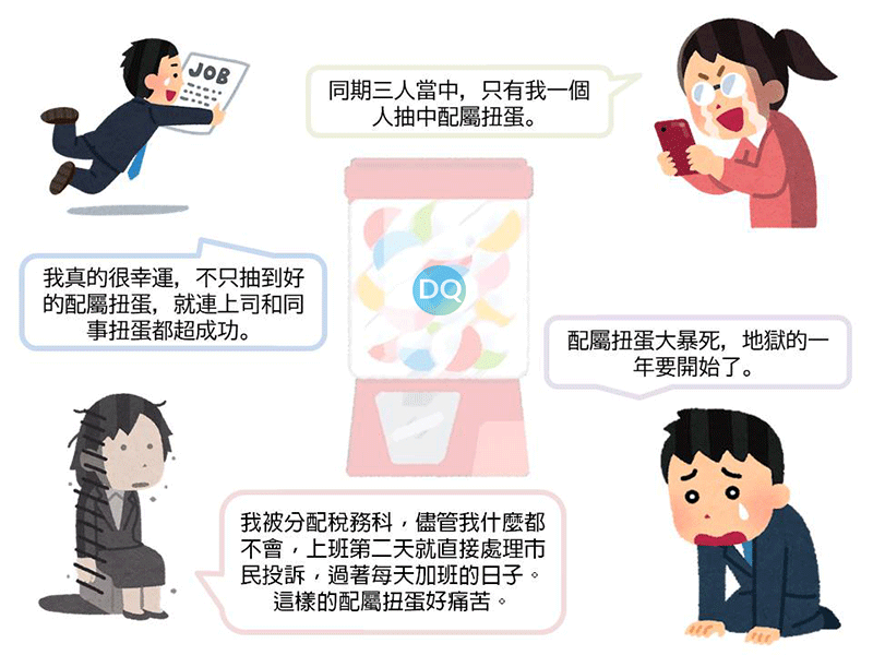 在正式入職前,公司會預先調查新人想要進入的部門,但最後實際分發的結果,也難以滿足所有人的心願,就像是「轉扭蛋」一樣,命運不是全然掌握在自己手中,一切都是隨機且不能選擇的。