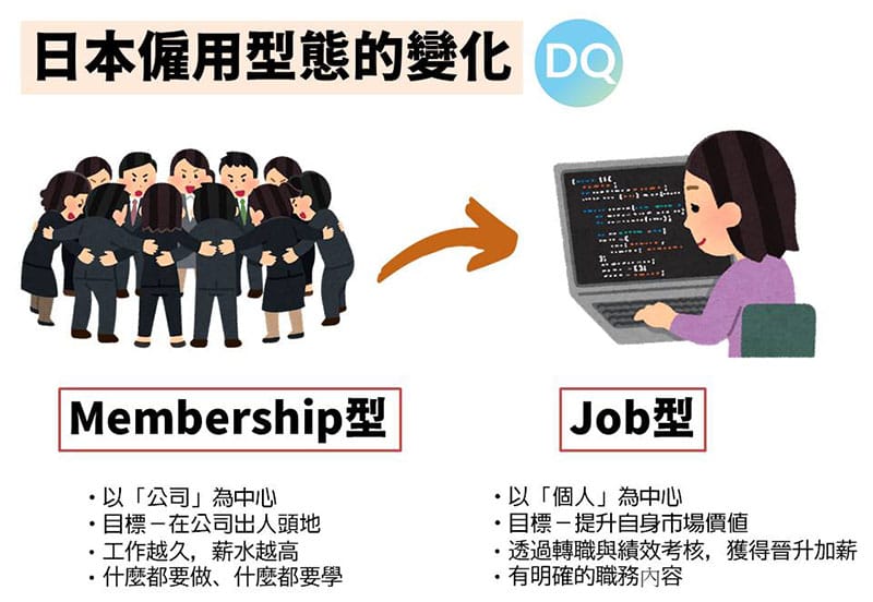 2020年日本經濟團體聯合會發布的指導分針中,呼籲企業應該重新審視日本傳統的僱用制度,並提出應導入以「職務」為基礎的JOB型僱用制度。但其背景,卻是受到新冠疫情爆發,以及全球化的影響,日本企業後知後覺的轉型。