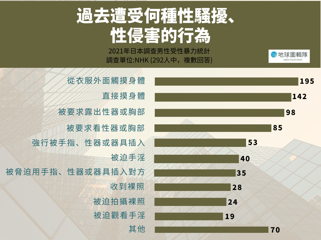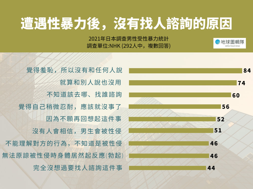 數量少,不代表沒有,而他們的聲音也應該被聽到。2021年,日本放送協會NHK針對「曾遭到性暴力對待的男性」進行問卷調查: