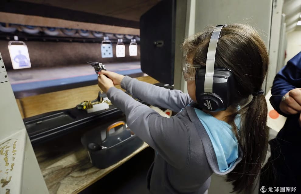 圖為洛杉磯一間射擊俱樂部,一名女孩正在體驗瞄靶射擊的快感。