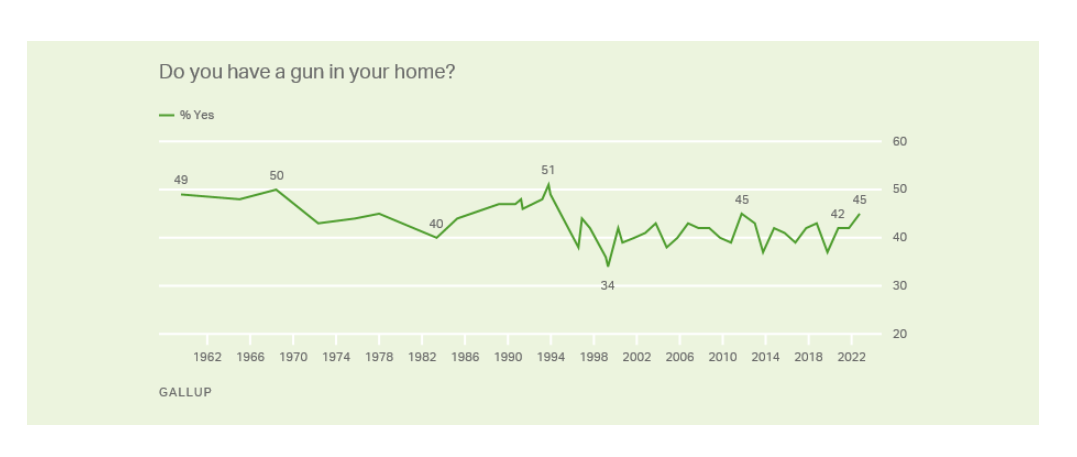 根據蓋洛普(GALLUP)的民意調查,受訪美國人中有57% 表示他們希望更嚴格的槍支管制法,32% 的人認為應維持現行法律,無須改變;還有10%的受訪者認為應該放寬法律管制。