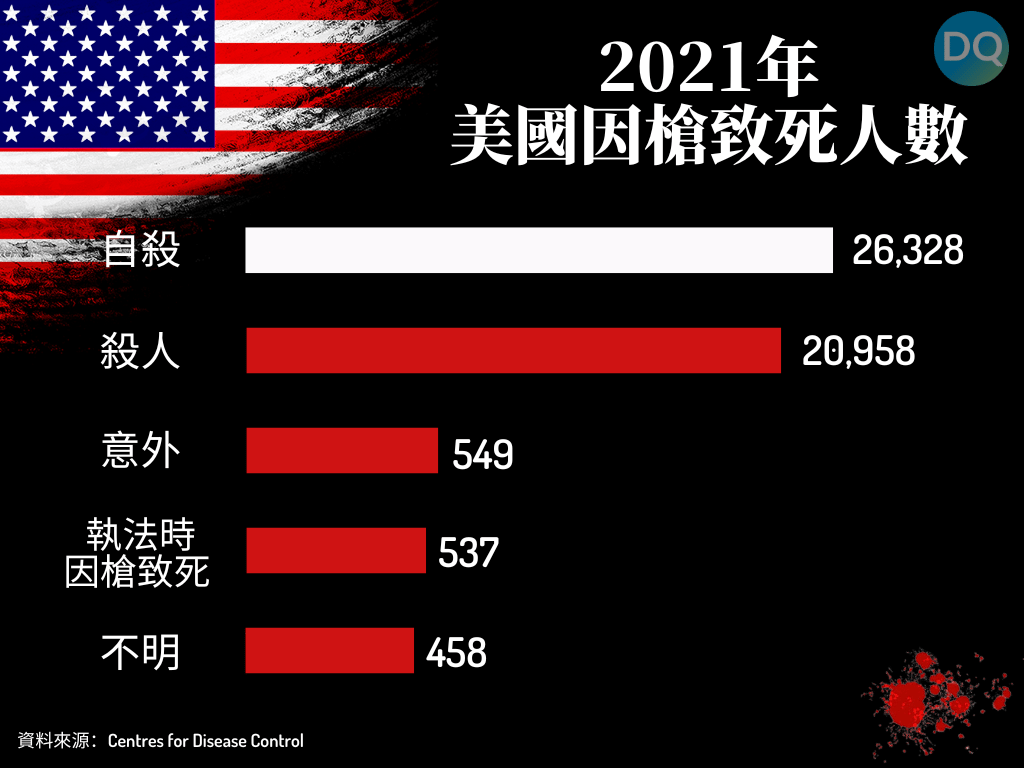 值得注意的是,大規模槍擊事件以及持槍謀殺,較容易會引起媒體報導以及社會觀關注;但事實上,在2021年因槍致死的人數中,有一半以上是自殺。