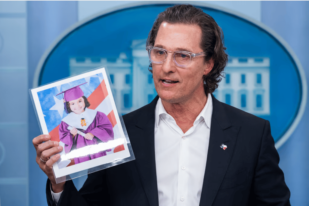 好萊塢演員馬修‧麥康納(Matthew McConaughey)拿著德州尤瓦爾迪小學(Uvalde)槍擊案受害者的遺照,在白宮記者會上呼籲各方看重在使用槍枝時應伴隨的責任。圖攝於2022年6月7日。