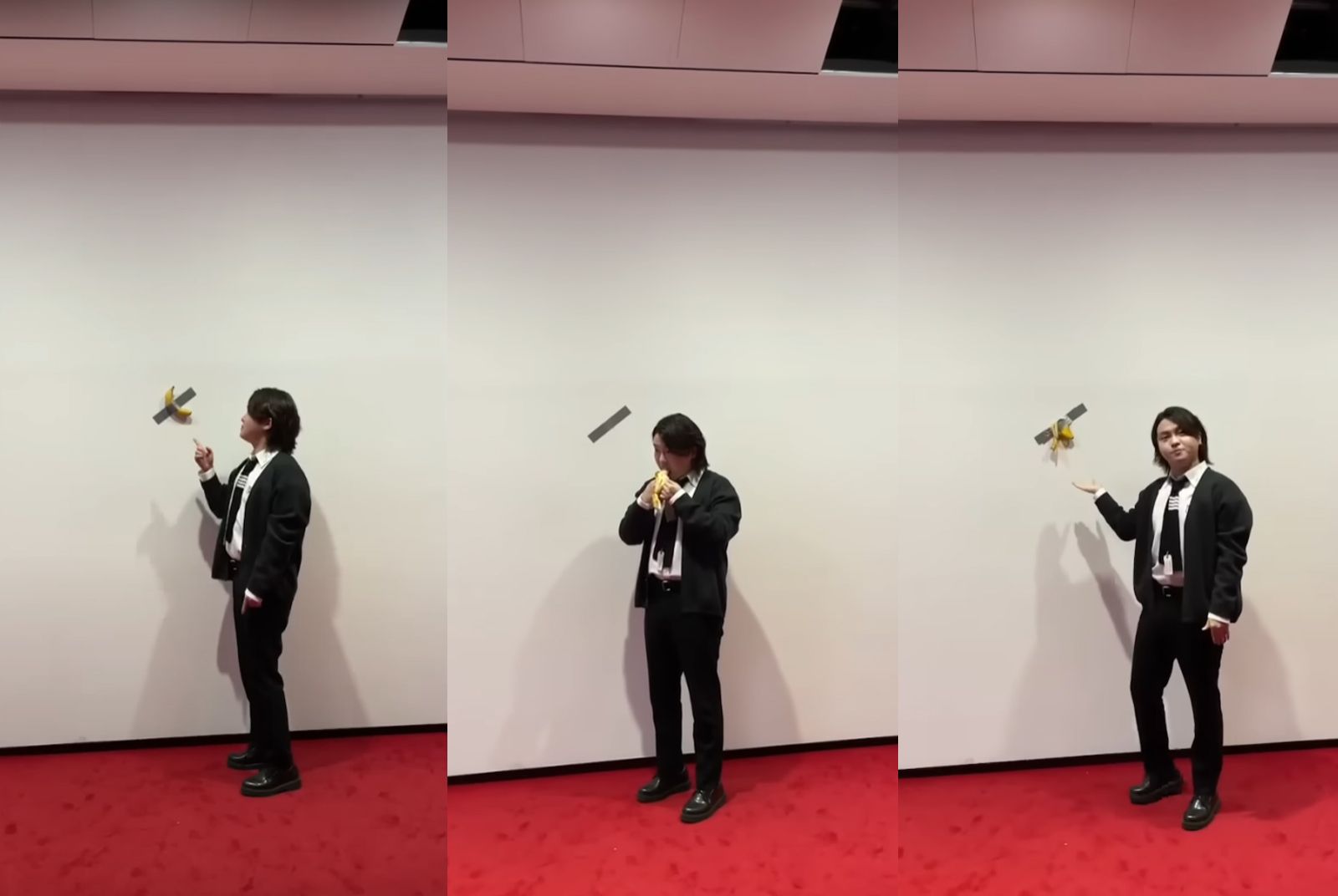 近日,《丑角》在Leeum美術館展出時,突有一名男子不疾不徐地走上前,從容地將牆上的香蕉拿下,將整根香蕉剝皮、吃下肚,隨後再將剩下的香蕉皮黏回牆上,向大家擺了一個展示姿勢後隨即離開。整段過程前後僅約1分鐘,被男子的朋友在一旁側錄下來。